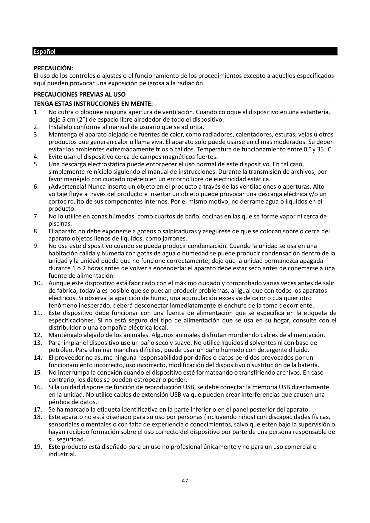 16. Si l’appareil a une fonction de lecture USB, il faut brancher la clé USB directement sur l'appareil. N'utilisez pas un câble d'extension USB, car cela peut causer des interférences entraînant des pertes de données.