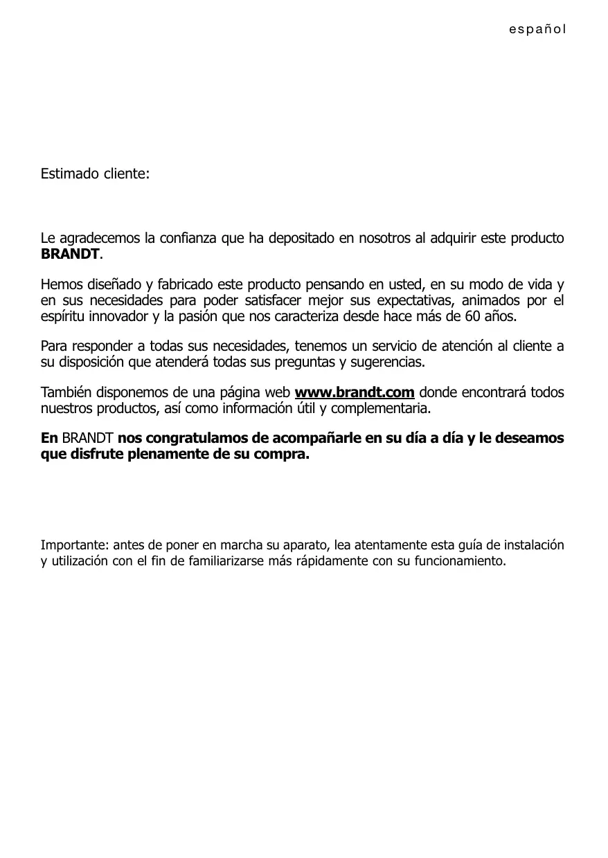 También disponemos de una pägina web www.brandt.com donde encontrarä todos nuestros productos, asi como informacién ütil y complementaria.