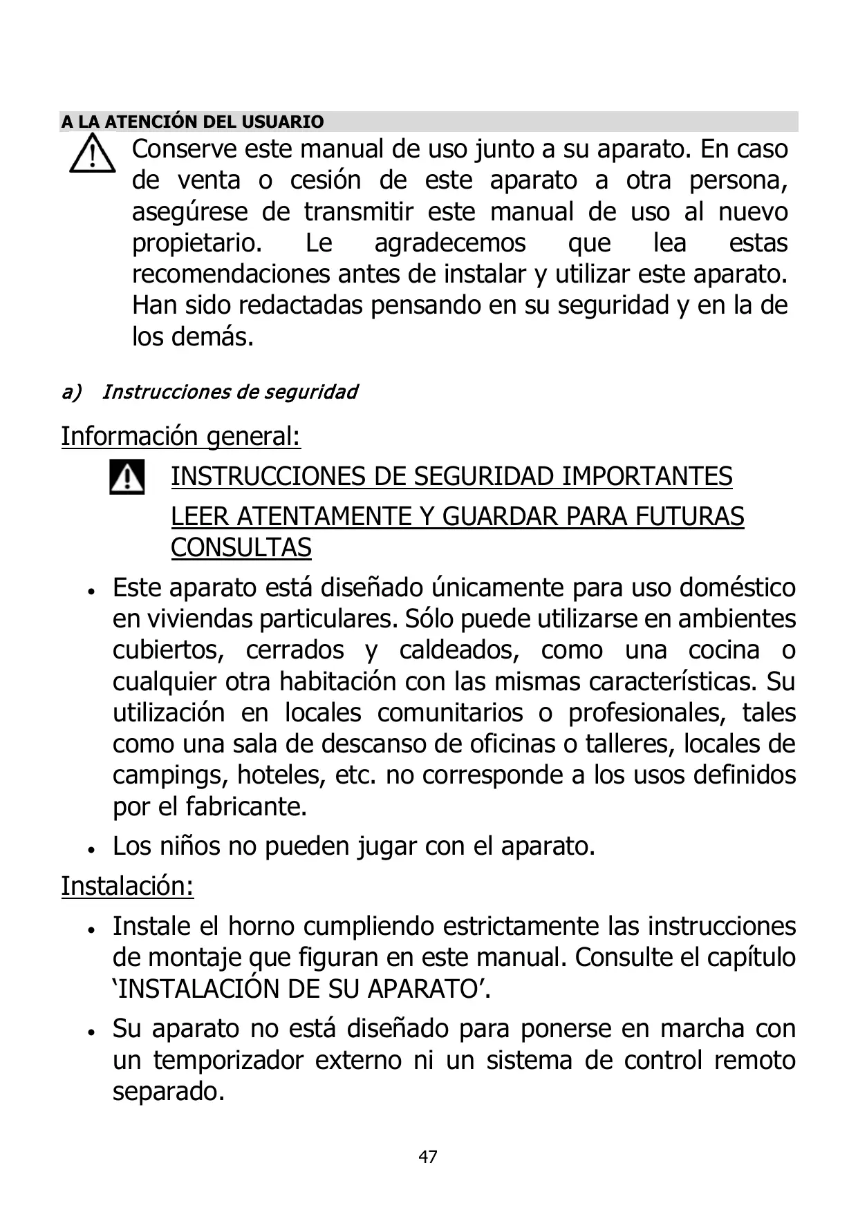 1) A LA ATENCION DEL USUARIO nee 47 a) Instrucciones de seguridad sisi 47