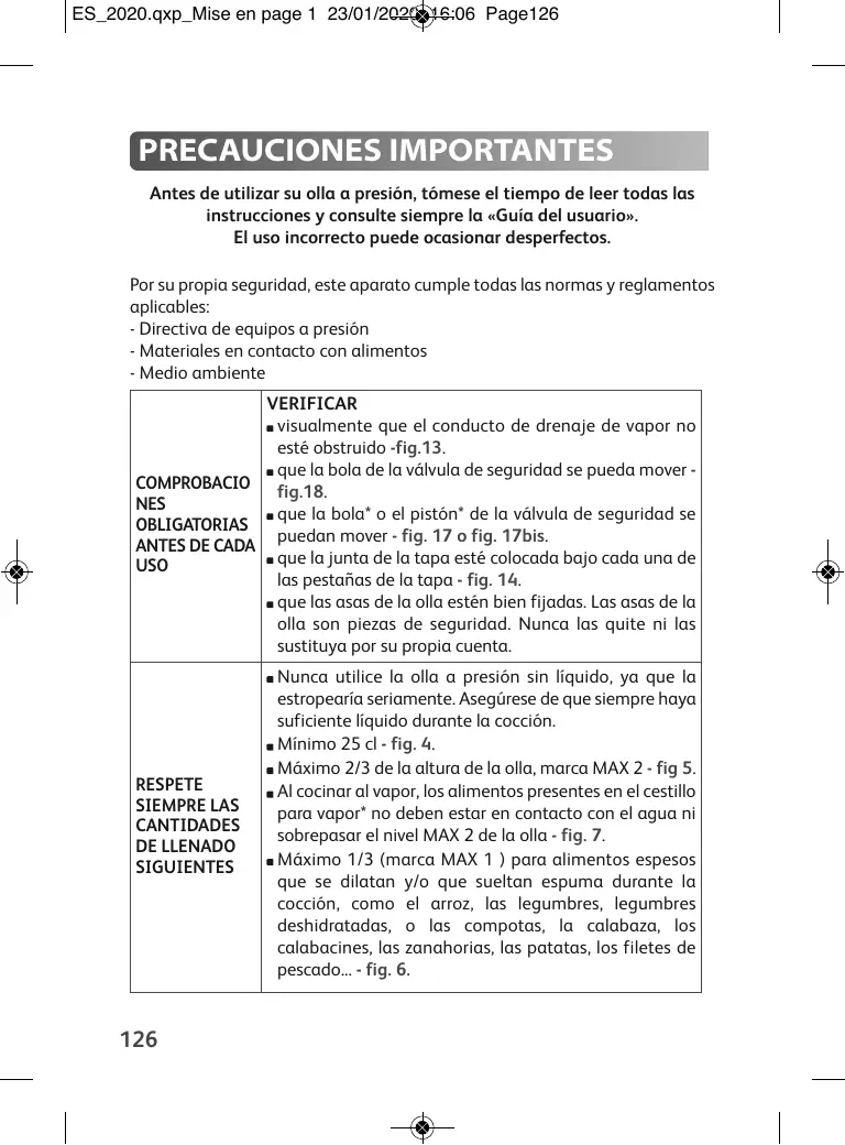 PRECAUCIONES IMPORTANNES Antes de utilizar su olla a presiôn, témese el tiempo de leer todas las instrucciones y consulte siempre la «Guia del usuario». El uso incorrecto puede ocasionar desperfectos.