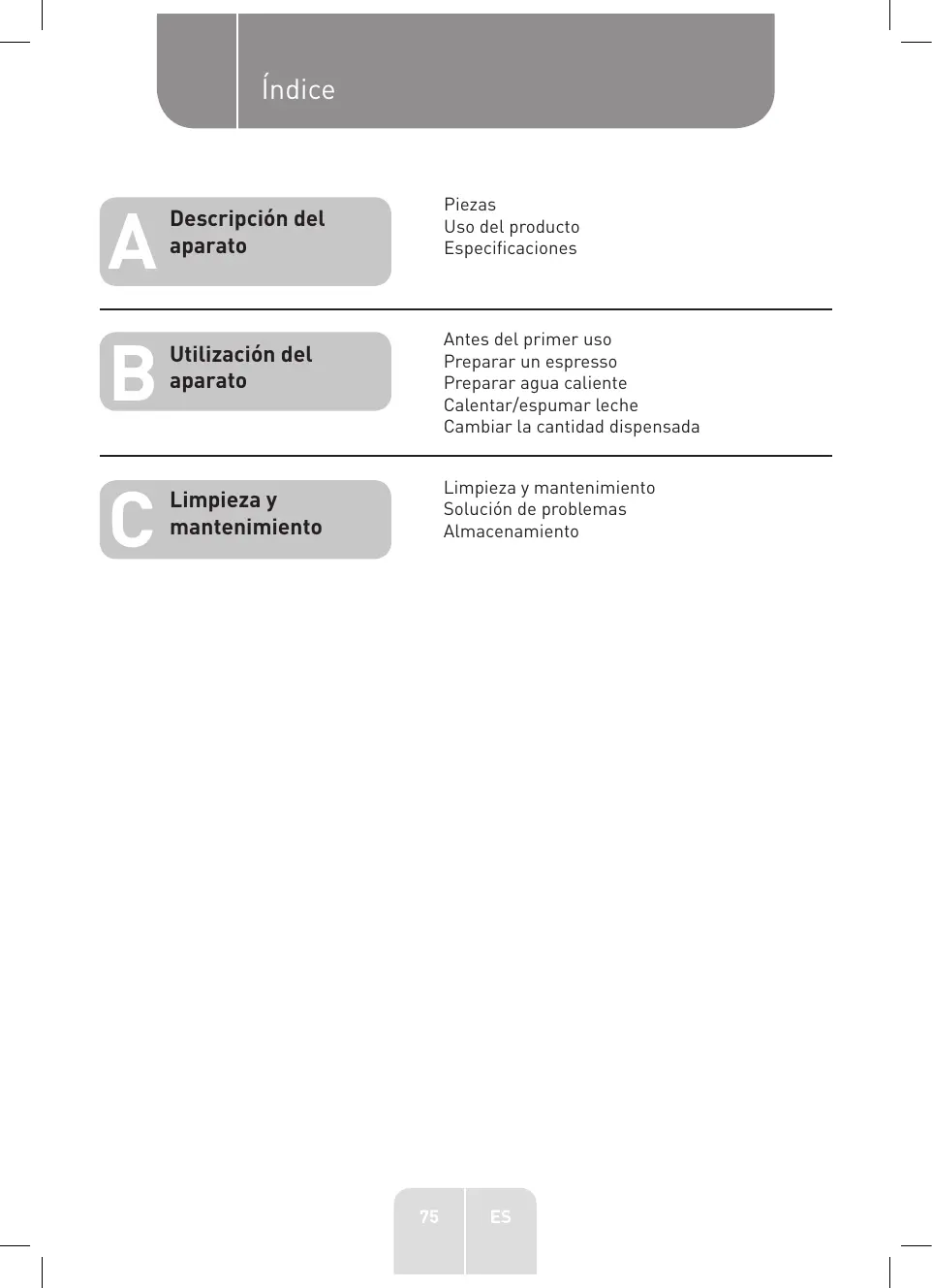 Piezas Uso del producto Especificaciones Antes del primer uso Preparar un espresso Preparar agua caliente Calentar/espumar leche Cambiar La cantidad dispensada Limpieza y mantenimiento Soluciôn de problemas Almacenamiento