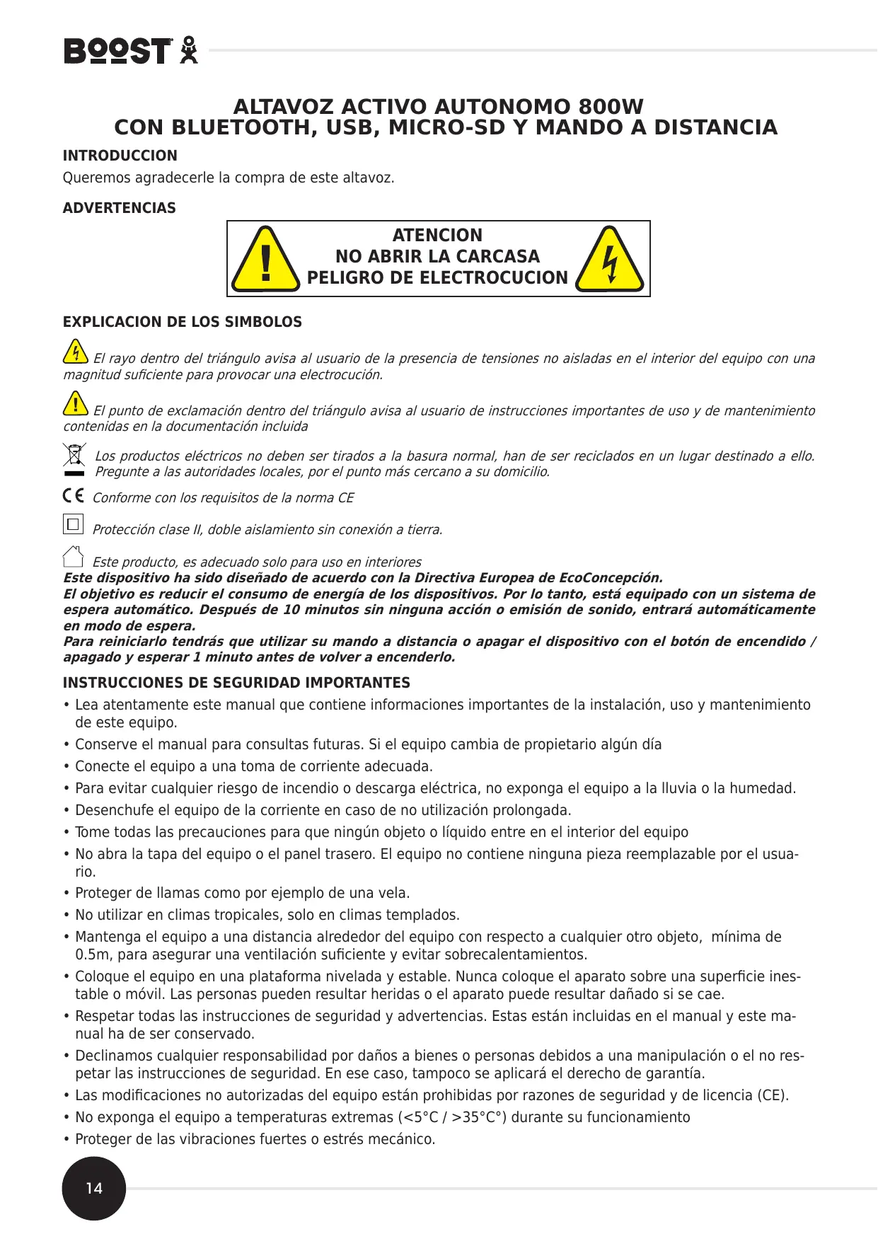 Descarga las instrucciones para tu Altavoz autoamplificado en formato PDF gratis! Encuentra tus instrucciones JUPITER 600 - BOOST y toma tu dispositivo electrónico nuevamente en la mano. En esta página están publicados todos los documentos necesarios para el uso de su dispositivo. JUPITER 600 de la marca BOOST.