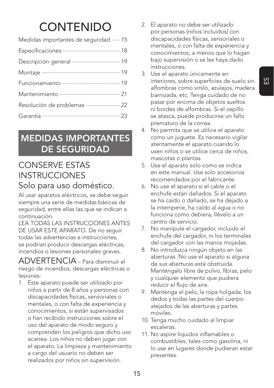 LEA TODAS LAS INSTRUCCIONES ANTES DE USAR ESTE APARATO. De no seguir todas las advertencias e instructaciones, se podrián produir descargas electricas, incendios o lesiones personales graves.