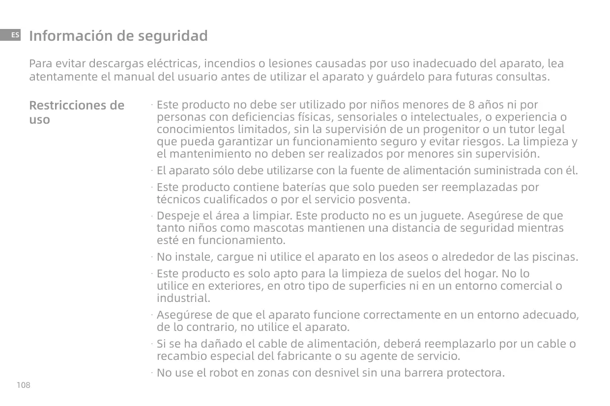 - No use el robot en zonas con desnivel sin una barrera protectora.