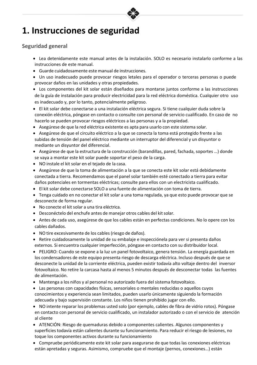 Seguridad general +_Lea detenidamente este manual antes de la instalaciôn. SOLO es necesario instalarlo conforme a las instrucciones de este manual. +_ Guarde cuidadosamente este manual de instrucciones. +_ Un uso inadecuado puede provocar riesgos letales para el operador o terceras personas o puede provocar daños en las unidades y otras propiedades. +_Los componentes del kit solar estän diseñados para montarse juntos conforme a las instrucciones de la guia de instalaciôn para producir electricidad para la red eléctrica doméstica. Cualquier otro uso es inadecuado y, por lo tanto, potencialmente peligroso. +_ El kit solar debe conectarse a una instalaciôn eléctrica segura. Si tiene cualquier duda sobre la conexiôn eléctrica, péngase en contacto o consulte con personal de servicio cualificado. En caso de no hacerlo se pueden provocar riesgos eléctricos a las personas y a la propiedad. +_Asegürese de que la red eléctrica existente es apta para usarlo con este sistema solar. +_Asegürese de que el circuito eléctrico a la que se conecta la toma esté protegido frente a las subidas de tensién del panel eléctrico mediante un interruptor del diferencial y un disyuntor mediante un disyuntor del diferencial. +_Asegürese de que la estructura de la construcciôn (barandillas, pared, fachada, soportes ) donde se vaya a montar este kit solar puede soportar el peso de la carga. +_ NOinstale el kit solar en el tejado de la casa. +_Asegürese de que la toma de alimentaciôn a la que se conecta este kit solar esté debidamente conectada a tierra. Recomendamos que el panel solar también esté conectado a tierra para evitar daños potenciales en tormentas eléctricas; consulte para ellos con un electricista cualificado. +_Elkit solar debe conectarse SOLO a una fuente de alimentaciôn con toma de tierra. +_ Tenga cuidado en no conectar el kit solar a una toma regulada, ya que esto puede provocar que se desconecte de forma regular. +_ Noconecte el kit solar a una tira eléctrica. +_ Desconéctelo del enchufe antes de manejar otros cables del kit solar. +_Antes de cada uso, asegürese de que los cables estän en perfectas condiciones. No lo opere con los cables dañados. +_ NOtire excesivamente de los cables (riesgo de daños). +_Retire cuidadosamente la unidad de su embalaje e inspecciénela para ver si presenta daños externos. Si encuentra cualquier imperfecciôn, péngase en contacto con su distribuidor local. +_ PELIGRO: Cuando se expone a la luz un panel fotovoltaico, genera tensiôn. La energia guardada en los condensadores de este equipo presenta riesgo de descarga eléctrica. Incluso después de que se desconecte la unidad de la corriente eléctrica, pueden existir todavia alto voltaje dentro del inversor fotovoltaico. No retire la carcasa hasta al menos 5 minutos después de desconectar todas las fuentes de alimentaciôn. + Mantenga a los niños y al personal no autorizado fuera del sistema fotovoltaico. +_ Las personas con capacidades fisicas, sensoriales o mentales reducidas o aquellos cuyos conocimientos y experiencia sean limitados, pueden usarlo nicamente siguiendo la formaciôn adecuada y bajo supervisiôn constante. Los nifios tienen prohibido jugar con ello. +_ NOintente reparar los problemas usted solo (por ejemplo, cables de fibra de vidrio rotos). Péngase en contacto con personal de servicio cualificado, un instalador autorizado o con el servicio de atenciôn al cliente +_ ATENCIÔN: Riesgo de quemaduras debido a componentes calientes. Algunos componentes y superficies todavia estän calientes durante su funcionamiento. Para reducir el riesgo de lesiones, no toque los componentes activos durante su funcionamiento + Compruebe periédicamente este kit solar para asegurarse de que todas las conexiones eléctricas estän apretadas y seguras. Asimismo, compruebe que el montaje (pernos, conexiones...) estän