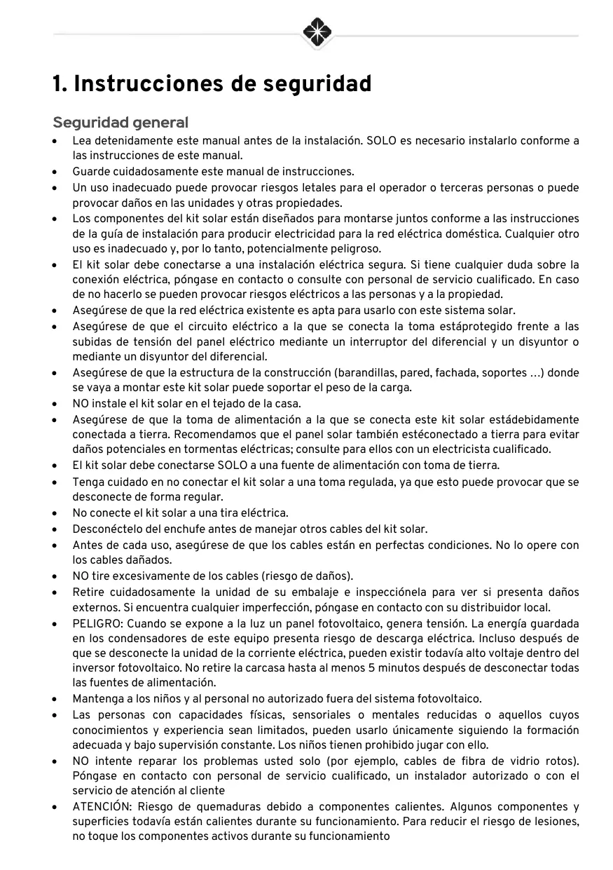 Seguridad general + Lea detenidamente este manual antes de la instalaciôn. SOLO es necesario instalarlo conforme à las instrucciones de este manual. + Guarde cuidadosamente este manual de instrucciones. + Un uso inadecuado puede provocar riesgos letales para el operador o terceras personas o puede provocar daños en las unidades y otras propiedades. + Los componentes del kit solar estén diseñados para montarse juntos conforme a las instrucciones de la guia de instalaciôn para producir electricidad para la red eléctrica doméstica. Cualquier otro uso es inadecuado y, por lo tanto, potencialmente peligroso. + El Kit solar debe conectarse a una instalaciôn eléctrica segura. Si tiene cualquier duda sobre la conexiôn eléctrica, péngase en contacto o consulte con personal de servicio cualificado. En caso de no hacerlo se pueden provocar riesgos eléctricos a las personas y a la propiedad. + Asegürese de que la red eléctrica existente es apta para usarlo con este sistema solar. + Asegürese de que el circuito eléctrico a la que se conecta la toma estéprotegido frente a las subidas de tensiôn del panel eléctrico mediante un interruptor del diferencial y un disyuntor o mediante un disyuntor del diferencial. + Asegürese de que la estructura de la construccién (barandillas, pared, fachada, soportes …) donde se vaya à montar este kit solar puede soportar el peso de la carga. + NO instale el kit solar en el tejado de la casa. + Asegürese de que la toma de alimentacién à la que se conecta este kit solar estédebidamente conectada a tierra. Recomendamos que el panel solar también estéconectado a tierra para evitar daños potenciales en tormentas eléctricas; consulte para ellos con un electricista cualificado. + Elkit solar debe conectarse SOLO a una fuente de alimentaciôn con toma de tierra. + Tenga cuidado en no conectar el kit solar a una toma regulada, ya que esto puede provocar que se desconecte de forma regular. + No conecte el kit solar a una tira eléctrica. + Desconéctelo del enchufe antes de manejar otros cables del kit solar. + Antes de cada uso, asegürese de que los cables estén en perfectas condiciones. No lo opere con los cables dañados. + NO tire excesivamente de los cables (riesgo de daños). *__Retire cuidadosamente la unidad de su embalaje e inspecciônela para ver si presenta daños externos. Si encuentra cualquier imperfeccién, péngase en contacto con su distribuidor local. + PELIGRO: Cuando se expone a la luz un panel fotovoltaico, genera tensién. La energia guardada en los condensadores de este equipo presenta riesgo de descarga eléctrica. Incluso después de que se desconecte la unidad de la corriente eléctrica, pueden existir todavia alto voltaje dentro del inversor fotovoltaico. No retire la carcasa hasta al menos 5 minutos después de desconectar todas las fuentes de alimentaciôn. + Mantenga a los niños y al personal no autorizado fuera del sistema fotovoltaico. + Las personas con capacidades fisicas, sensoriales o mentales reducidas o aquellos cuyos conocimientos y experiencia sean limitados, pueden usarlo ünicamente siguiendo la formaciôn adecuada y bajo supervisiôn constante. Los niños tienen prohibido jugar con ello. + NO intente reparar los problemas usted solo (por ejemplo, cables de fibra de vidrio rotos). Péngase en contacto con personal de servicio cualificado, un instalador autorizado o con el servicio de atenciôn al cliente + ATENCION: Riesgo de quemaduras debido a componentes calientes. Algunos componentes y superficies todavia estén calientes durante su funcionamiento. Para reducir el riesgo de lesiones, no toque los componentes activos durante su funcionamiento