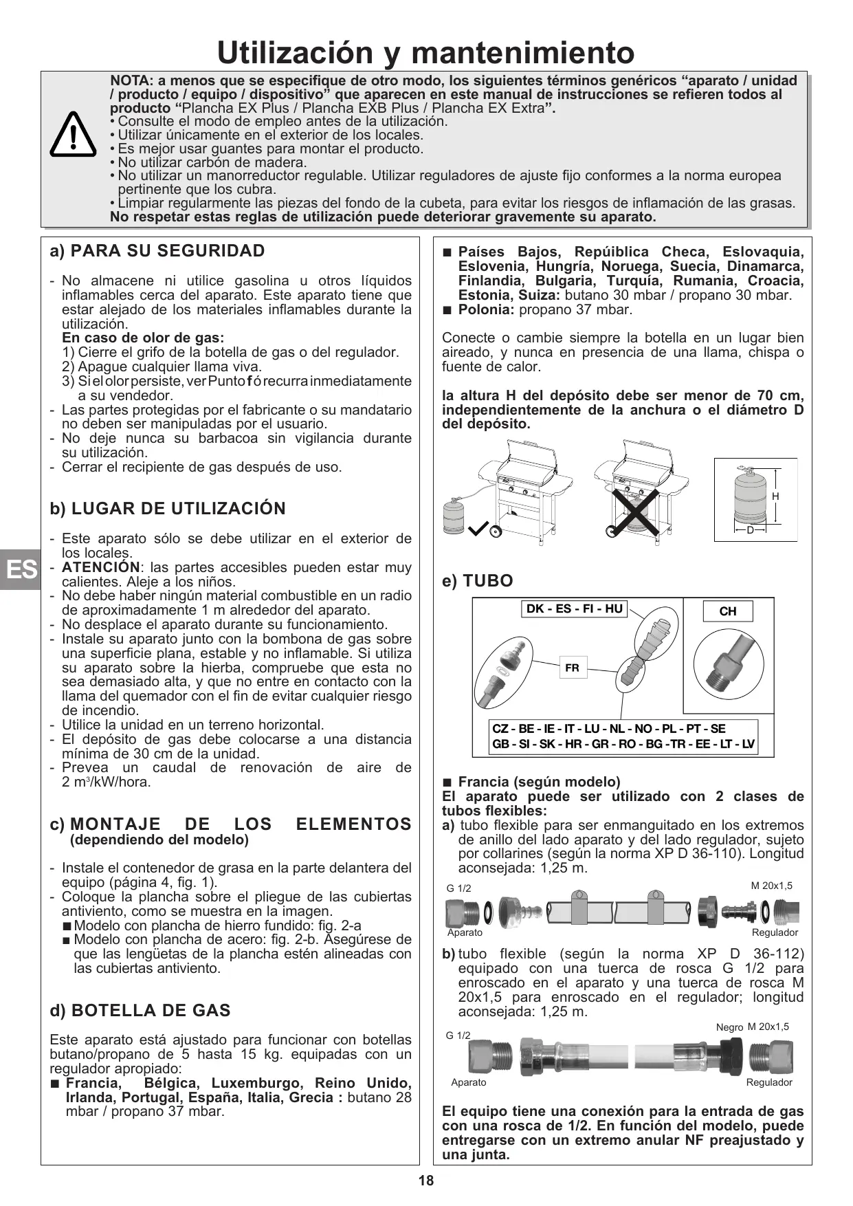 d) BOUTEILLE DE GAZ Cet appareil est réglé pour fonctionner avec les bouteilles butane/propane de 5 à 15 kg munies d’un détendeur approprié :