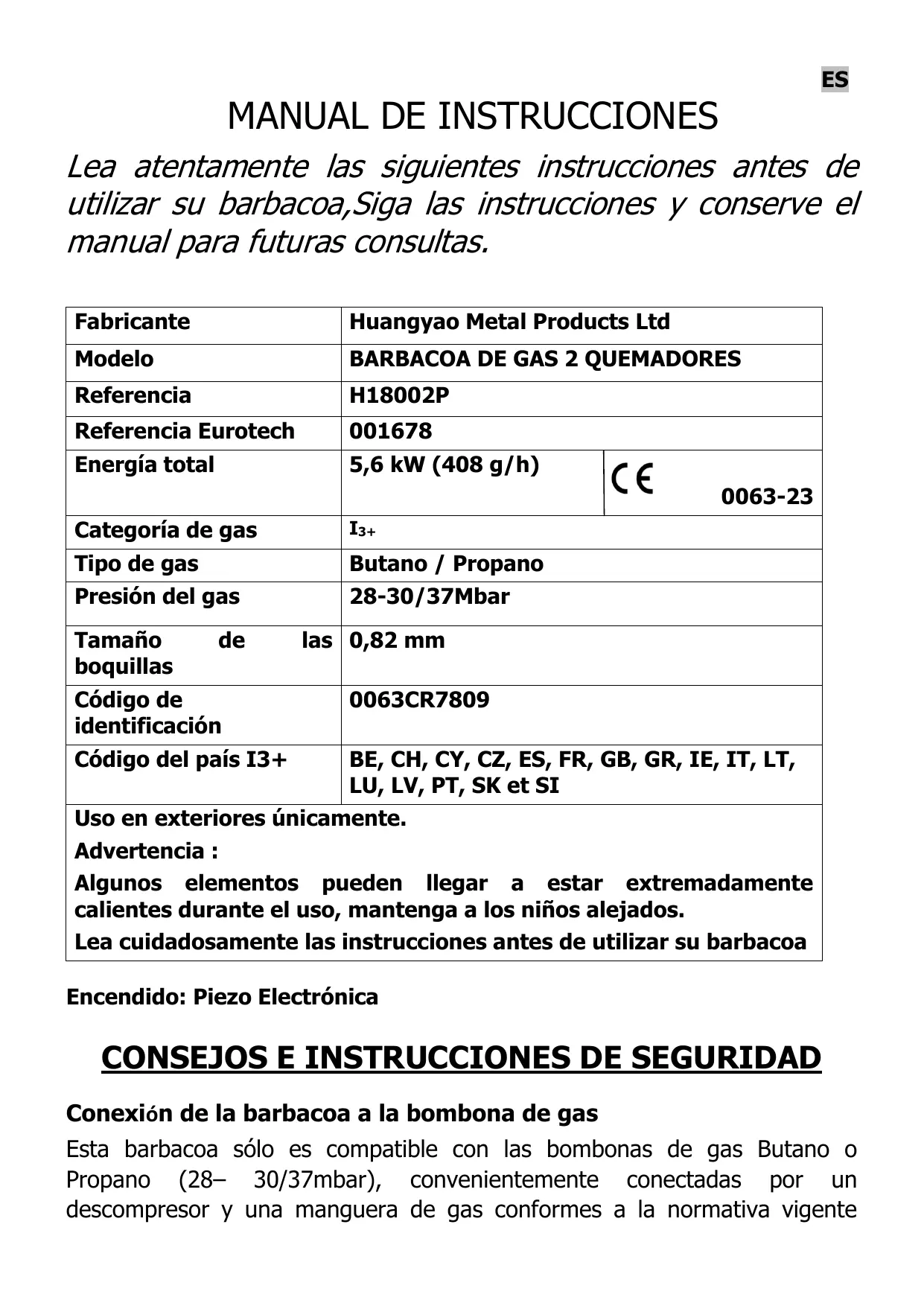 Utilice esta barbacoa sólo en el exterior. Antes del uso, compruebe que no haya fugas. Nunca lo compruebe con una llama, utilice una solución jabonosa.