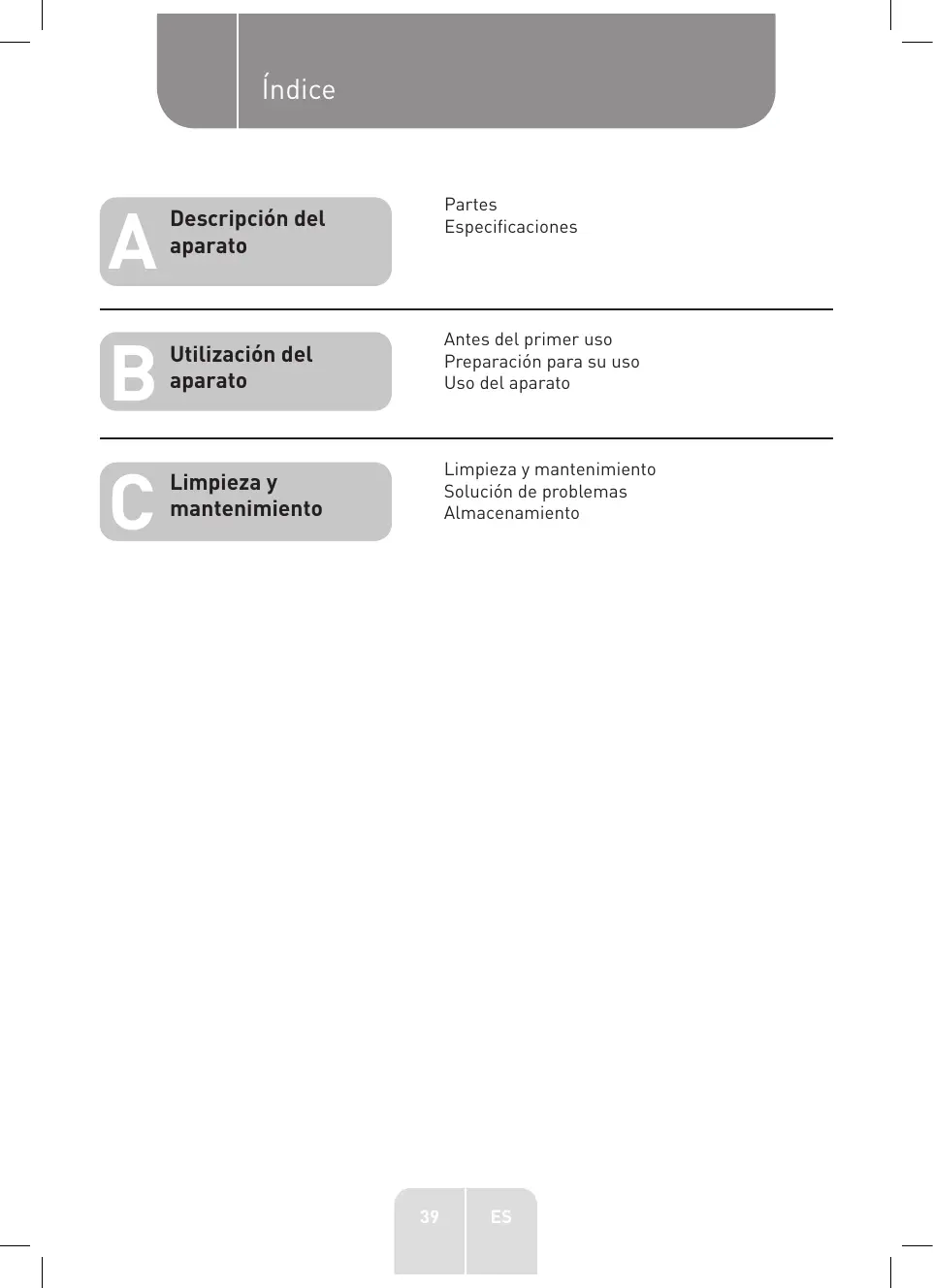 Partes Especificaciones Antes del primer uso Preparacién para su uso Uso del aparato Limpieza y mantenimiento Soluciôn de problemas Almacenamiento