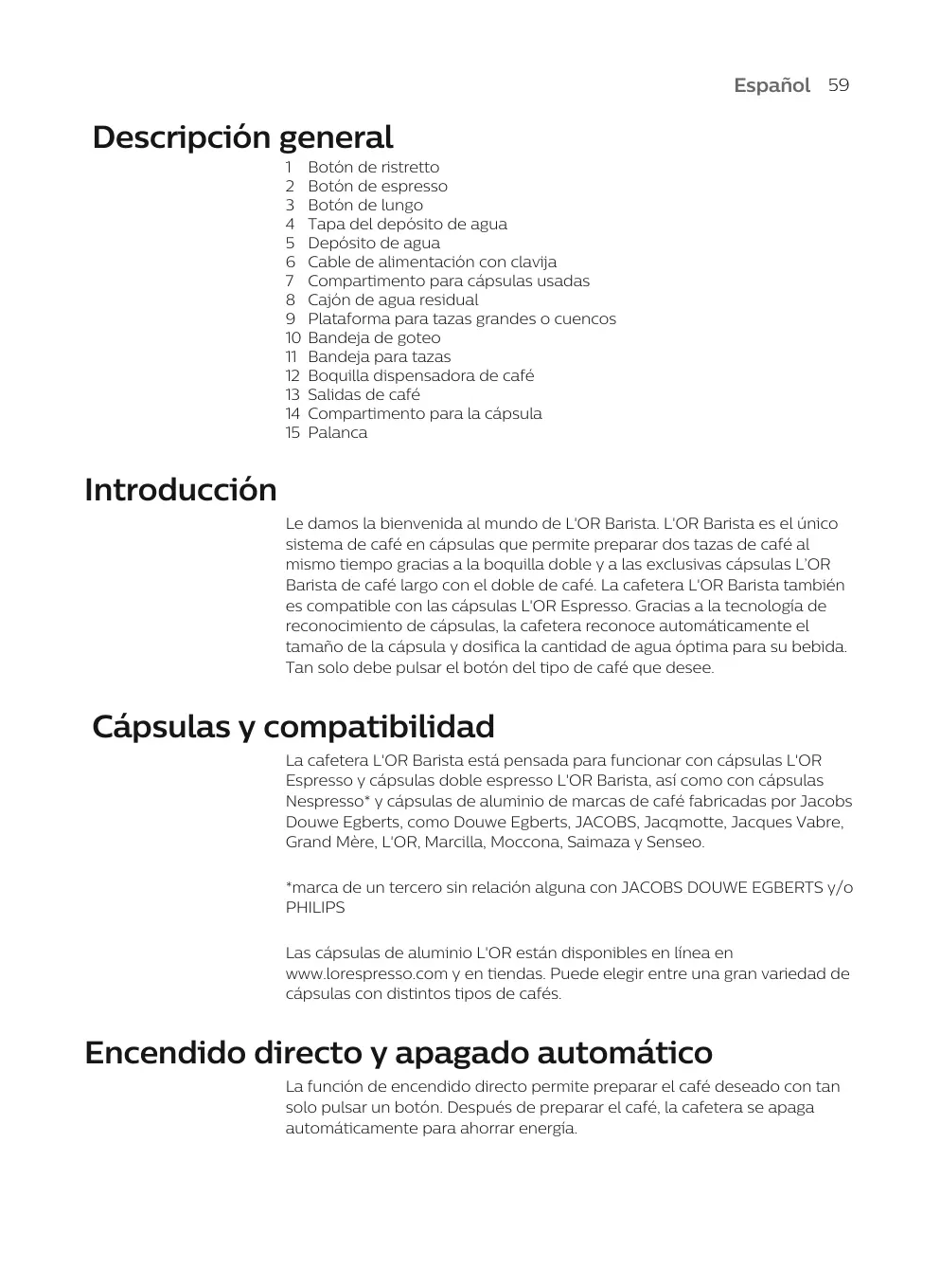 La cafetera L'OR Barista estä pensada para funcionar con câpsulas L'OR Espresso y câpsulas doble espresso L'OR Barista, asi como con câpsulas Nespresso” y câpsulas de aluminio de marcas de café fabricadas por Jacobs Douwe Egberts, como Douwe Egberts, JACOBS, Jacqmotte, Jacques Vabre. Grand Mêre, L'OR, Marcilla, Moccona, Saimaza y Senseo