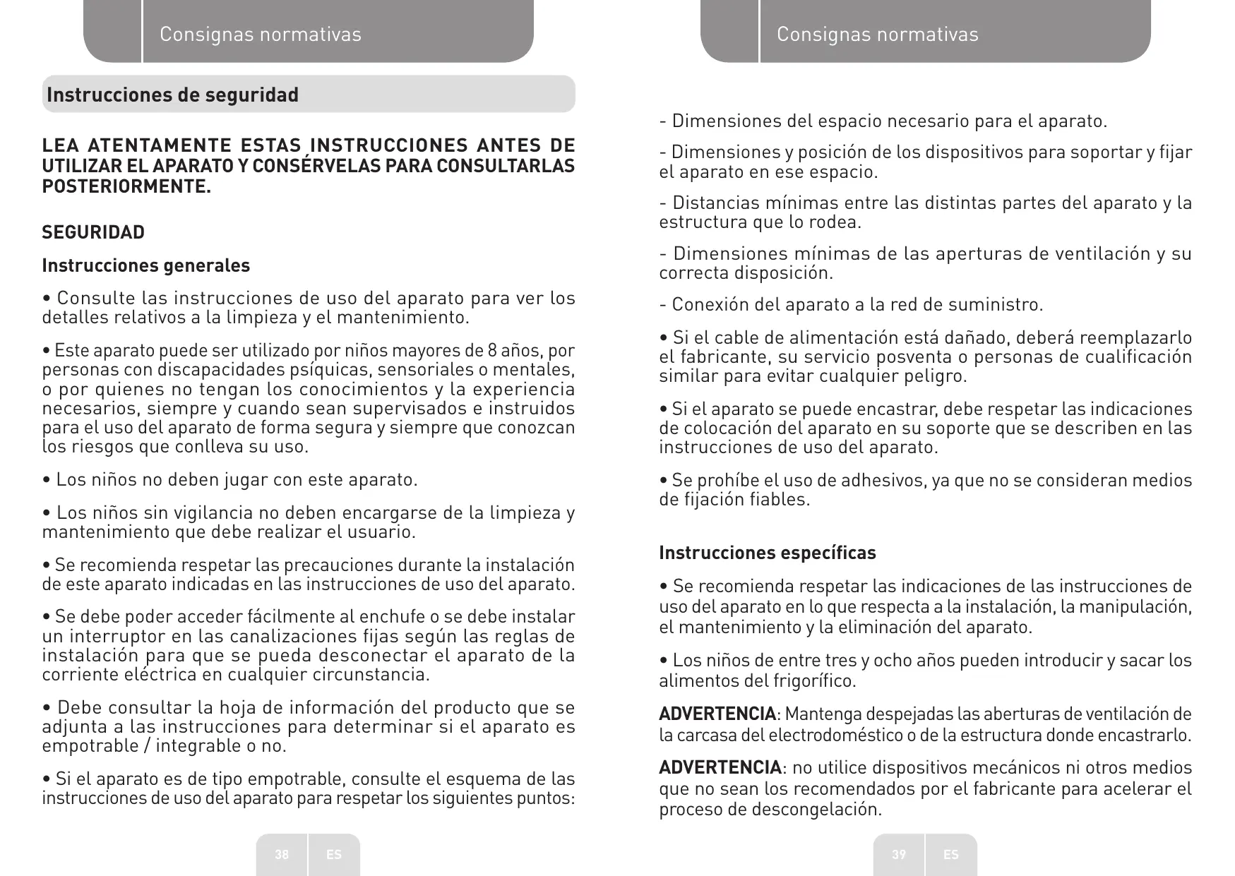 ADVERTENCIA: Respete las instrucciones para la clasificaciôn y el reciclaje del aparato especificadas al final de estas instrucciones, esto también se aplica al gas refrigerante contenido en el compresor y el circuito de refrigeracién, que nunca debe evaporarse al aire libre.