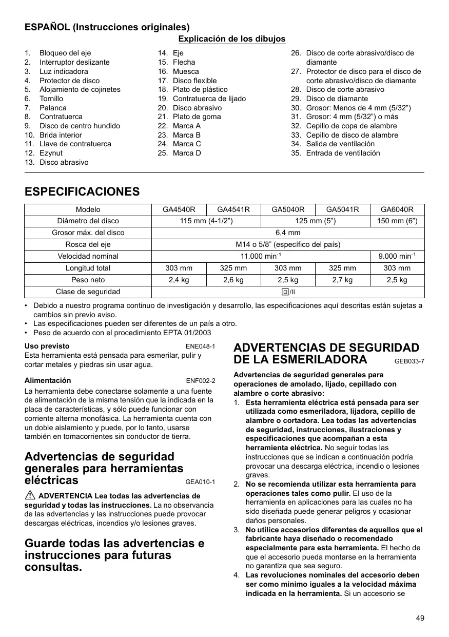 Designaciôn de la mäquina: Esmeriladora Angular N° de modelo/ Tipo: GA4540R, GA4541R, GA5040R, GA5041R, GA6040R Cumplen con las siguientes Directivas europeas: 2006/42/CE Se han fabricado de acuerdo con los siguientes eständares o documentos estandarizados: