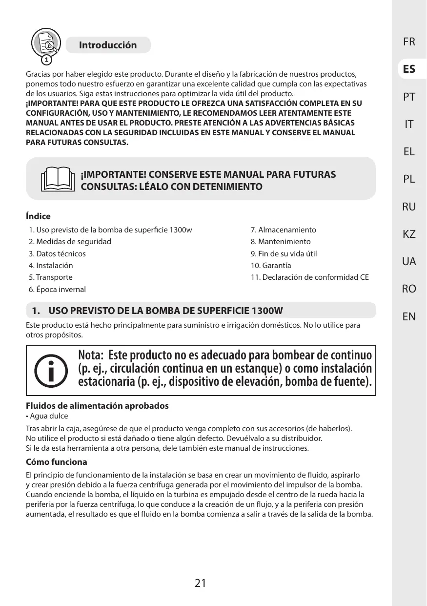 iIMPORTANTE! CONSERVE ESTE MANUAL PARA FUTURAS CONSULTAS: LÉALO CON DETENIMIENTO Indice 1. Uso previsto de la bomba de superficie 1300w 7. Almacenamiento 2. Medidas de seguridad 8. Mantenimiento 3. Datos técnicos 9. Fin de su vida ütil 4. Instalaciôn 10. Garantia 5. Transporte 11. Declaraciôn de conformidad CE