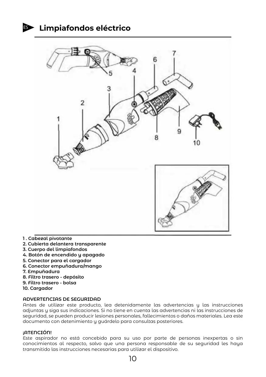 En caso de que el cable de alimentacién esté dañado la sustituciôn debe realizarla el fabricante, su agente de mantenimiento u otra personas cualificada para evitar todos los riesgos. Cercionese de que tanto el limpiafondos como el cargador estän completamente secos antes de recargar el aparato