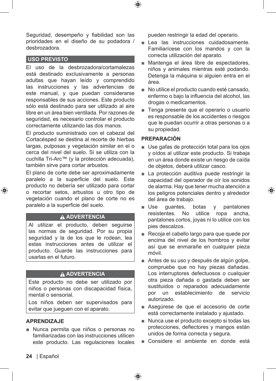 USO PREVIS El uso de la desbrozadora/cortamalezas estâ destinado exclusivamente a personas adultas que hayan leido y comprendido las instrucciones y las advertencias de este manual, y que puedan considerarse responsables de sus acciones. Este producto sélo està destinado para ser utilizado al aire libre en un ärea bien ventilada. Por razones de seguridad, es necesario controlar el producto correctamente utilizando las dos manos.