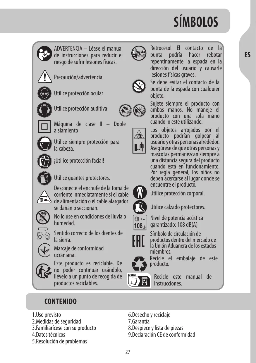 Retrocesol El contacto de la punta podria hacer rebotar repentinamente la espada en la direcciôn del usuario y causarle lesiones fisicas graves. Se debe evitar el contacto de la punta de la espada con cualquier objeto. Sujete siempre el producto con ambas manos. No maneje el producto con una sola mano cuando lo esté utilizando. Los objetos arrojados por el producto podrian gopear al usuario y otras personas alrededor. Asegürese de que otras personas y mascotas permanezcan siempre à una distancia segura del producto cuando esté en funcionamiento. Por regla general, los niños no deben acercarse al lugar donde se encuentre el producto. Utilice protecciôn corporal. Utilice calzado protectores. Nivel de potencia acüstica garantizado: 108 dB(A) Simbolo de circulaciôn de roductos dentro del mercado de là Uniôn Aduanera de los estados miembros. Redicle el embalaje de este producto. Recicle este manual de instrucciones. CONTENIDO 1.Uso previsto 2.Medidas de seguridad 3.Familiaricese con su producto 4.Datos técnicos 5.Resolucién de problemas