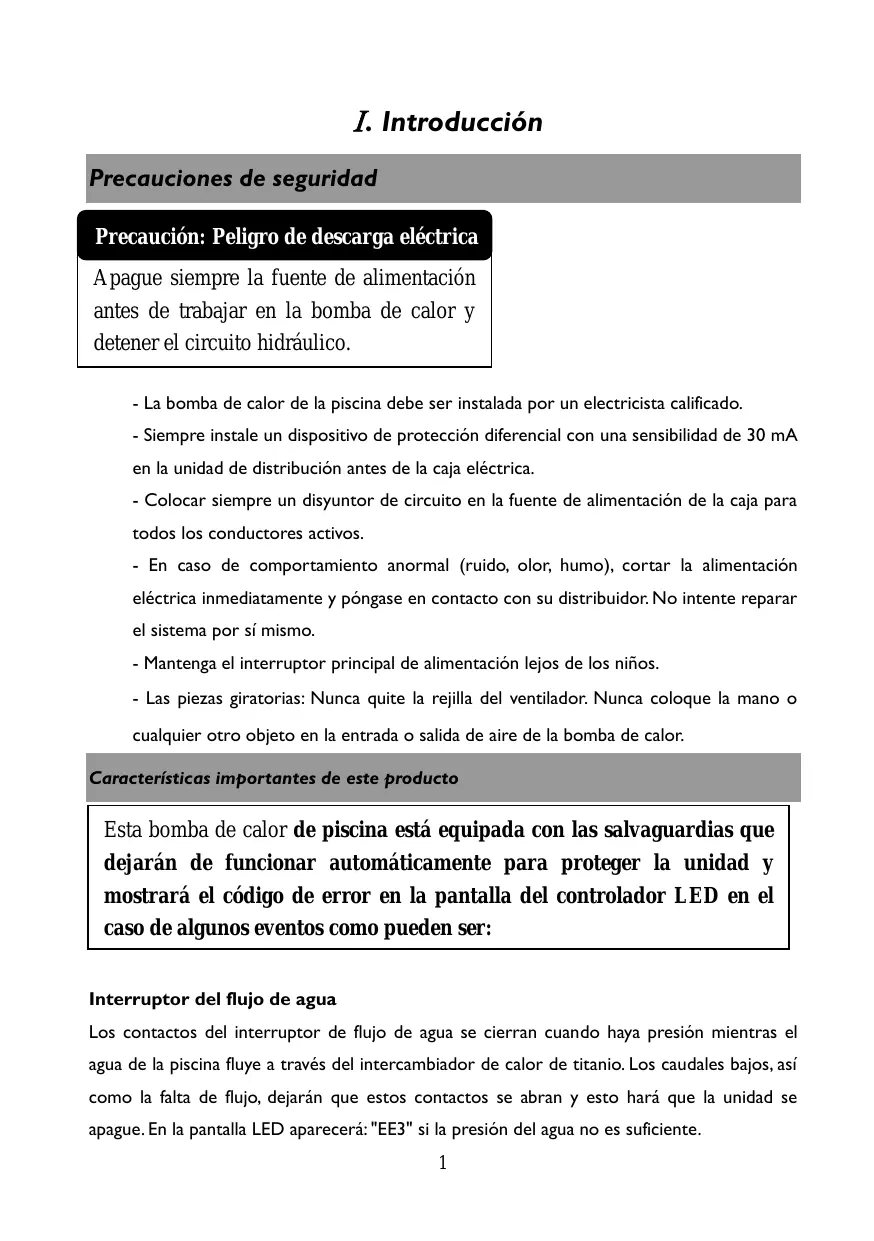 Interruptor del flujo de agua Los contactos del interruptor de flujo de agua se cierran cuando haya presién mientras el agua de la piscina fluye a través del intercambiador de calor de titanio. Los caudales bajos, asi como la falta de flujo, dejarän que estos contactos se abran y esto harä que la unidad se apague. En la pantalla LED aparecerä:"EE3" si la presiôn del agua no es suficiente.