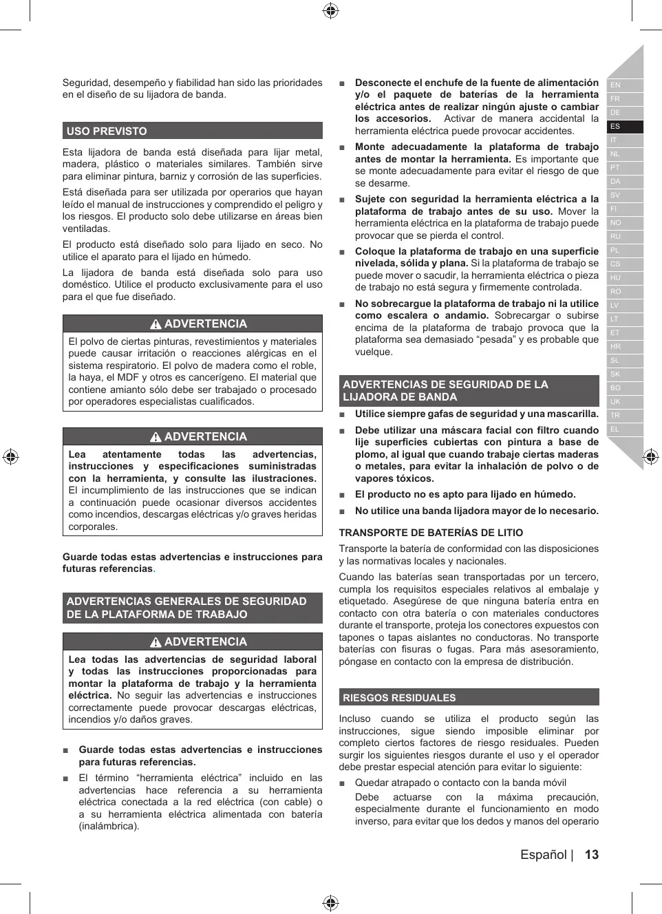 AVERTISSEMENTS DE SECURITE RELATIFS A PONCEUSE À BANDE