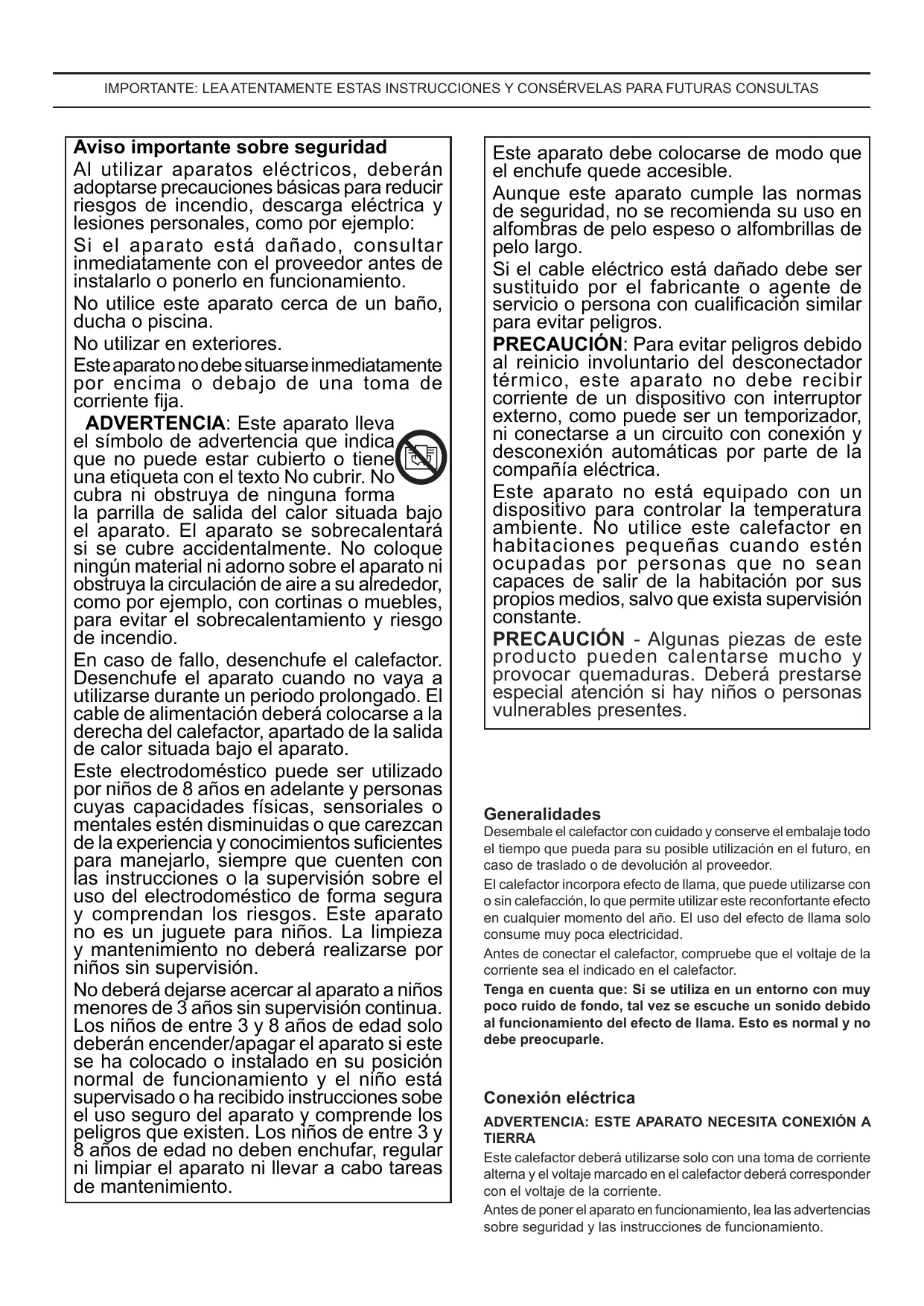 | Funciones principales | Calefacción, efecto de llamas ajustable, control remoto |