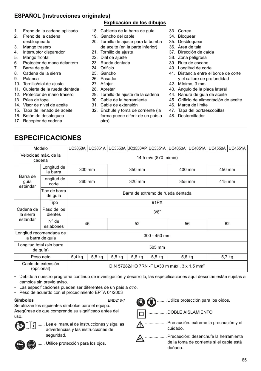 1. Freno de la cadena aplicado 18. Cubierta de la barra de guia 33. Correa 2. Freno de la cadena 19. Gancho del cable 34. Bloquear desbloqueado 20. Tornillo de ajuste para la bomba 35. Desbloquear 3. Mango trasero de aceite (en la parte inferior) 36. Ârea de tala 4. Interruptor disparador 21. Tornilo de ajuste 37. Direccién de caida 5. Mango frontal 22. Dial de ajuste 38. Zona peligrosa 6. Protector de mano delantero 23. Rueda dentada 39. Ruta de escape 7... Barra de guia 24. Orificio 40. Longitud de corte 8. Cadena de la sierra 25. Gancho 41. Distancia entre el borde de corte 9. Palanca 26. Pasador y el calibre de profundidad 10. Torillo/dial de ajuste 27. Aflojar 42. Minimo, 3 mm 11. Cubierta de la rueda dentada 28. Apretar 43. Angulo de la placa lateral 12. Protector de mano trasero 29. Tornilo de ajuste de la cadena 44. Ranura de guia de aceite 13. Püas de tope 30. Cable de la herramienta 45. Orificio de alimentaciôn de aceite 14. Visor de nivel de aceite 31. Cable de extension 46. Marca de limite 15. Tapa de llenado de aceite 32. Enchufe y toma de corriente (la 47. Tapa del portaescobillas 16. Botôn de desbloqueo forma puede diferir de un pais a 48. Destomillador 17. Receptor de cadena otro) ESPECIFICACIONES Modelo UC3050A [UC3051A [uC3550a [uC3550AP[uC3551A [UC4050A [ UC4051A [UCA550A [UCA551A Velocidad mäx. de la 44,5 mis (870 mimin) cadena Longitud de a barra 300 mm 350 mm 400 mm 450 mm Barra de guia ronge de 260 mm 320 mm 355 mm 415 mm eständar ÎTipo de barra de quia Barra de extremo de rueda dentada Tipo SIPX Cadena de | Paso de los ae lasierra | dientes eständar TJ N' ge 46 52 56 62 eslabones Longitud recomendada de la barra de guia 800 - 460 mm Longitud total (sin barra 505 mm de guia) Peso neto 54kg [ 55kg [ 55k9 [ 56k9 | 55k ] 5,6 kg 5,7 kg Cable de extensiôn = 2 (opaional) DIN 57282/HO 7RN -F L=30 m mâx., 3 x 1,5 mm'