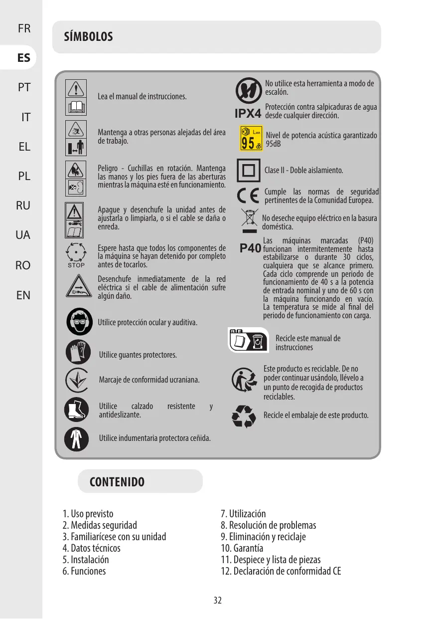Les pannes résultant d'une usure normale ou d'une utilisation inappropriée du produit ne sont pas couvertes par la garantie. Cela indut, entre autres, les interrupteus, le disjoncteur de sécurité etles moteurs en cas d'usure.