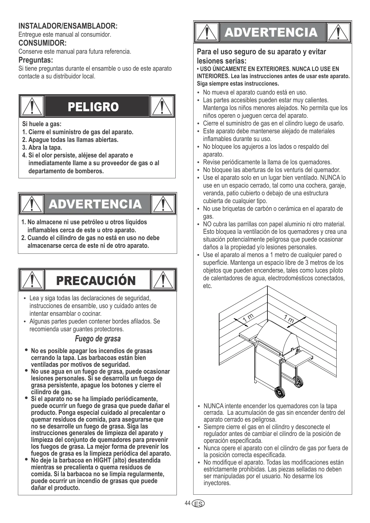 + NO desconecte o cambie el recipiente de gas a menos de 3 metros de una lama abierta o fuente de igniciôn.