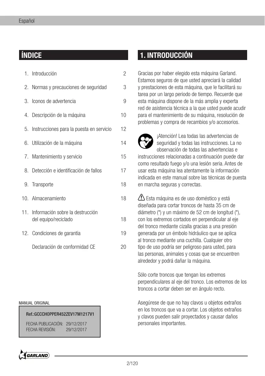 PIN Esta mäquina es de uso doméstico y estâ diseñada para cortar troncos de hasta 35 cm de diämetro (*) y un mäximo de 52 cm de longitud (*), con los extremos cortados en perpendicular al eje del tronco mediante cizalla gracias a una presiôn generada por un émbolo hidräulico que se aplica al tronco mediante una cuchilla. Cualquier otro tipo de uso podria ser peligroso para usted, para las personas, animales y cosas que se encuentren alrededor y podrä dañar la mäquina.