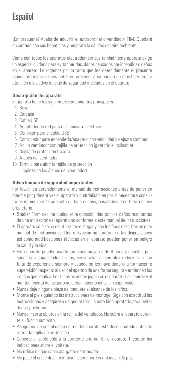 llimpieza de los élabes del ventilador) Advertencias de seguridad importantes Por favor, lea detenidamente el manual de instrucciones antes de poner en marcha por primera vez el aparato y guérdelas bien por si necesitara consul- tarlas de nuevo més adelante o, dado el caso, pasärselas à un futuro nuevo propietario. + Stadler Form declina cualquier responsabilidad por los daños resultantes de una utilizaciôn del aparato no conforme a este manual de instrucciones. El aparato sôlo se ha de utilizar en el hogar y con los fines descritos en este manual de instrucciones. Una utilizaciôn no conforme à las disposiciones asf como modificaciones técnicas en el aparato pueden poner en peligro la salud y la vida Este aparato pueden usarlo los niños mayores de 8 años y aquellas per- sonas con capacidades fisicas, sensoriales o mentales reducidas o con falta de experiencia siempre y cuando se les haya dado una formaciôn o supervisién respecto al uso del aparato de una forma segura y entiendan los riesgos que implica. Los niños no deben jugar con el aparato. La limpieza y el mantenimiento del usuario no deben hacerlo niños sin supervisiôn: Nunca deje ninguna pieza del paquete al alcance de los niños. Monte el pie siguiendo las instrucciones de montaje. Siga con exactitud las instrucciones y asegürese de que el tornillo esté bien apretado para evitar daños y peligros. Nunca inserte objetos en la rejilla del ventilador. No cubra el aparato duran- te su funcionamiento. Asegürese de que el cable de red del aparato esté desenchufado antes de retirar la rejilla de protecciôn Conecte el cable sélo à la corriente altema. En el aparato, ffese en las indicaciones sobre el voltaje. + No utilice ningün cable alargador estropeado + No pase el cable de alimentaciôn sobre bordes afilados ni lo pise: