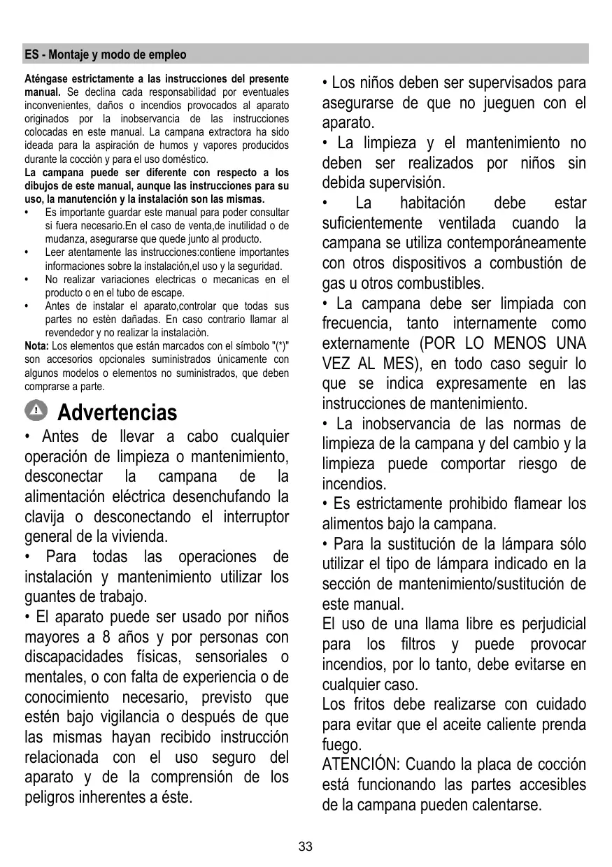 + Ne pas utiliser ou laisser la hotte sans les lampes correctement montées, car un éventuel risque de choc