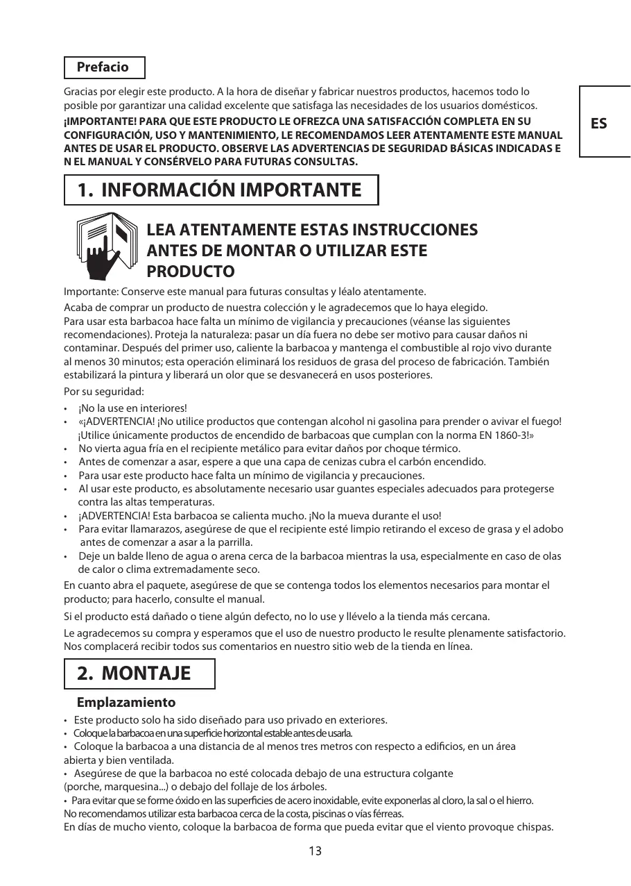 + Ce produit est prévu pour un usage domestique et extérieur. + Le barbecue doit être installé sur un support horizontal stable avant utilisation + Disposez l'appareil à au moins trois mètres des bâtiments, dans un espace ouvert et aéré. + Assurez-vous que l'appareil ne soit pas situé sous une structure suspendue (porche, abri sous un feuillage.