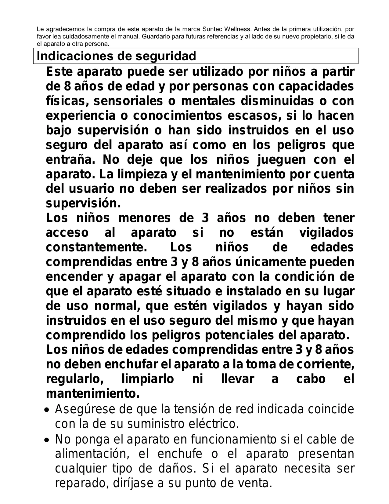 En caso de que necesite asistencia técnica, péngase en contacto con su distribuidor especializado. Denominacién del producto: Nümero de serie: Nombre del comprador: Fecha de compra: Sello y firma del distribuidor especializado: Fabricante: Nous nous engageons de remettre en état votre appareil gratuitement pendant la période de garantie de 24 mois ou alors de mettre à disposition les pièces détachées gratuitement à votre commerçant spécialisé, si votre appareil devait défaillir en raison d'une erreur de fabrication ou d’un vice de matériel côté production. Toute revendication à notre encontre allant au-delà est exclue. Nous n'assumons pas de responsabilité pour des endommagements dans des cas de force majeure, en cas de manipulation incorrecte, en cas de non-respect de la notice, en cas d'usure due au fonctionnement ou pour des dommages survenus sur le chemin du transport. Ce certificat est uniquement valable avec la facture correspondante. En cas d'intervention de service, veuillez ramener le produit acheté à votre commerçant spécialisé. Désignation de l’article : Numéro de série : Nom de l'acheteur : Date de l’achat : Cachet et signature du commerçant spécialisé : Fabricant : Suntec Wellness GmbH HolzstraRe 2