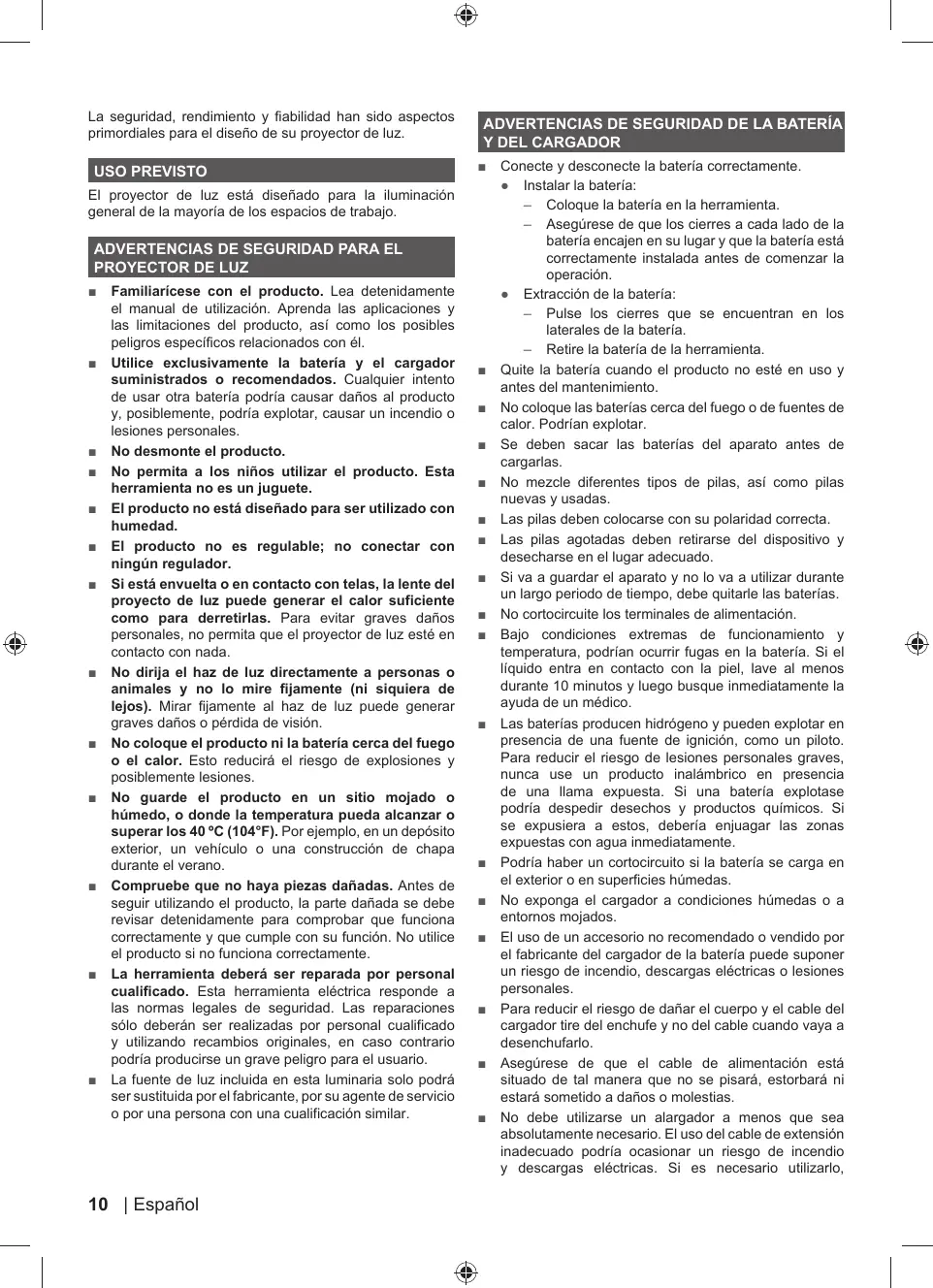 = Apprenez à connaître le produit. Lisez avec attention le manuel d'utilisation. Prenez connaissance des applications et des limitations de l'appareil ainsi que des risques potentiels spécifiques qui lui sont attachés. Utilisez uniquement la batterie et le chargeur fournis ou recommandés. Toute tentative d'utilisation d'un autre bloc de batterie endommagera le produit et serait susceptible de provoquer une explosion, un incendie, ou des blessures. Ne démontez pas le produit. Ne laissez aucun enfant utiliser le produit Ce n'est pas un jouet. Ce produit n'est pas conçu pour fonctionner dans des conditions humides ou mouillées. Ce produit n’est pas variable ; ne le connectez pas à des variateurs. Si le verre de la lampe de travail est enveloppé ou placé en contact avec un tissu, il est susceptible de produire suffisamment de chaleur pour faire fondre le tissu. Pour éviter toute blessure grave, ne laissez jamais le verre de la lampe de travail entrer en contact avec quoi que ce soit. Ne dirigez pas le faisceau de lumière sur les personnes et les animaux et ne regardez pas dans le faisceau vous-même (même à distance). Regarder le faisceau peut entraîner des lésions graves voire la perte de la vision. Ne posez pas le produit ou le bloc de batterie à proximité d'un feu ou d’une source de chaleur. Vous réduirez ainsi les risques d'explosion et de blessures. Ne stockez pas le produit dans un endroit humide ou mouillé, ou dans un endroit dont la température est susceptible d'atteindre ou de dépasser 40°C. Par exemple, dans une remise extérieure, un véhicule ou un bâtiment en tôle pendant l'été. Vérifiez qu'aucune pièce n'est endommagée. Avant toute utilisation prolongée du produit, une pièce endommagée doit être examinée prudemment afin de déterminer si elle va fonctionner correctement et comme prévu. N'utilisez pas le produit s’il ne fonctionne pas correctement. =_ Faites réparer votre outil par du personnel qualifié. Cet outil électrique est conforme aux normes légales de sécurité. Les réparations ne doivent être effectuées que par du personnel qualifié utilisant des pièces de rechange d'origine; dans le cas contraire, l'utilisateur s'exposerait à de graves dangers. = La source lumineuse contenue dans ce luminaire doit être remplacée uniquement pas le fabricant ou un de