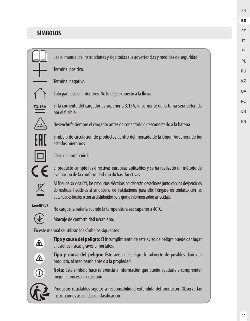 2. Avant d'utiliser le chargeur, lisez le manuel dans son intégralité et prenez connaissance des symboles de mise en garde figurant sur le chargeur et la batterie.