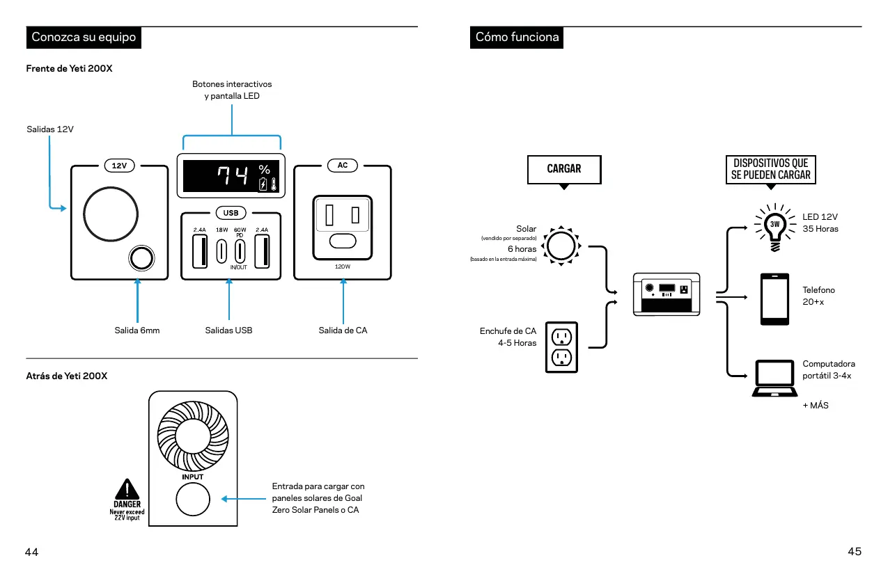 Primero, necesitaré determinar la cantidad de energla que su dispositivo requiere. Esto puede requerir que usted investigue por su cuente, busque en el Internet o revise la guia de usuario para su dispositivo. En segundo lugar, deberd verificar la capacidad de los puertos de salida individuales. Por ejemplo, el puerto de CA del Goal Zero Yeti esté alimentado por un inversor que permite 120W de potencia. Esto significa que, si su dispositivo esté recibiendo més de 120 W durante un perfodo de tiempo prolongade, el inversor de Goal Zero Yeti se apagaré. Otro punto a tener en cuenta es el nivel de sobretensiones de su dispositivo en comparaciôn con el del puerto. El inversor de Goal Zero Yeti tiene un avanzado sistema de manejo de sobretensiones que maximizaré su compatibilidad con varios dispositivos, pero todavia habré elementos que aumentarän a un ritmo més alto, y durante un tiempo més largo, que el Goal Zero Yeti puede manejar, en tal caso el puerto se apagaré por si mismo. Por üiltimo, una vez que sepa que su dispositivo es compatible, deberé determinar durante cuänto tiempo podré encender su equipo con el Goal Zero Yeti. Aqui le presentamos una leccién breve sobre la energia. Todos los adaptadores y generadores solares de Goal Zero