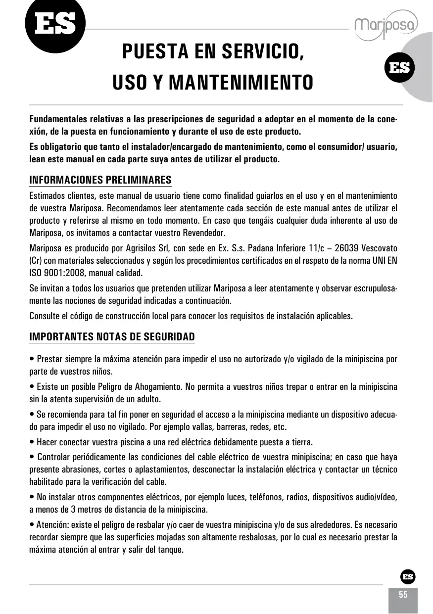 Mariposa est un produit Agrisilos Srl, dont le siège est dans l'Ex. S.s. Padana Inferiore 11/c - 26039 Ves- covato (Cr) avec des matériaux sélectionnés et selon des procédures certifiées conformes à la norme UNI EN 1S0 9001:2008, manuel qualité.