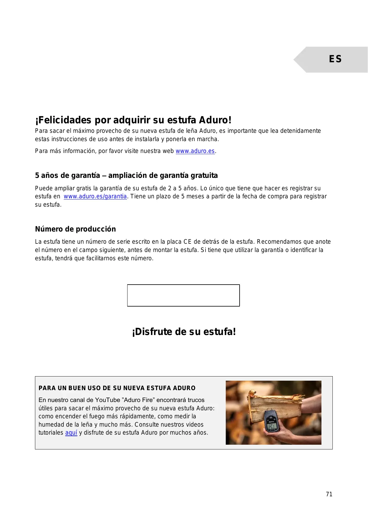 Vous avez la possibilité de faire passer la garantie de votre poêle à bois de 2 ans à 5 ans, etce, gratuitement. Il vous suffit d'enregistrer votre poêle sur www.aduro.fr/garantie/ dans les 5 mois suivants l'achat de votre appareil.