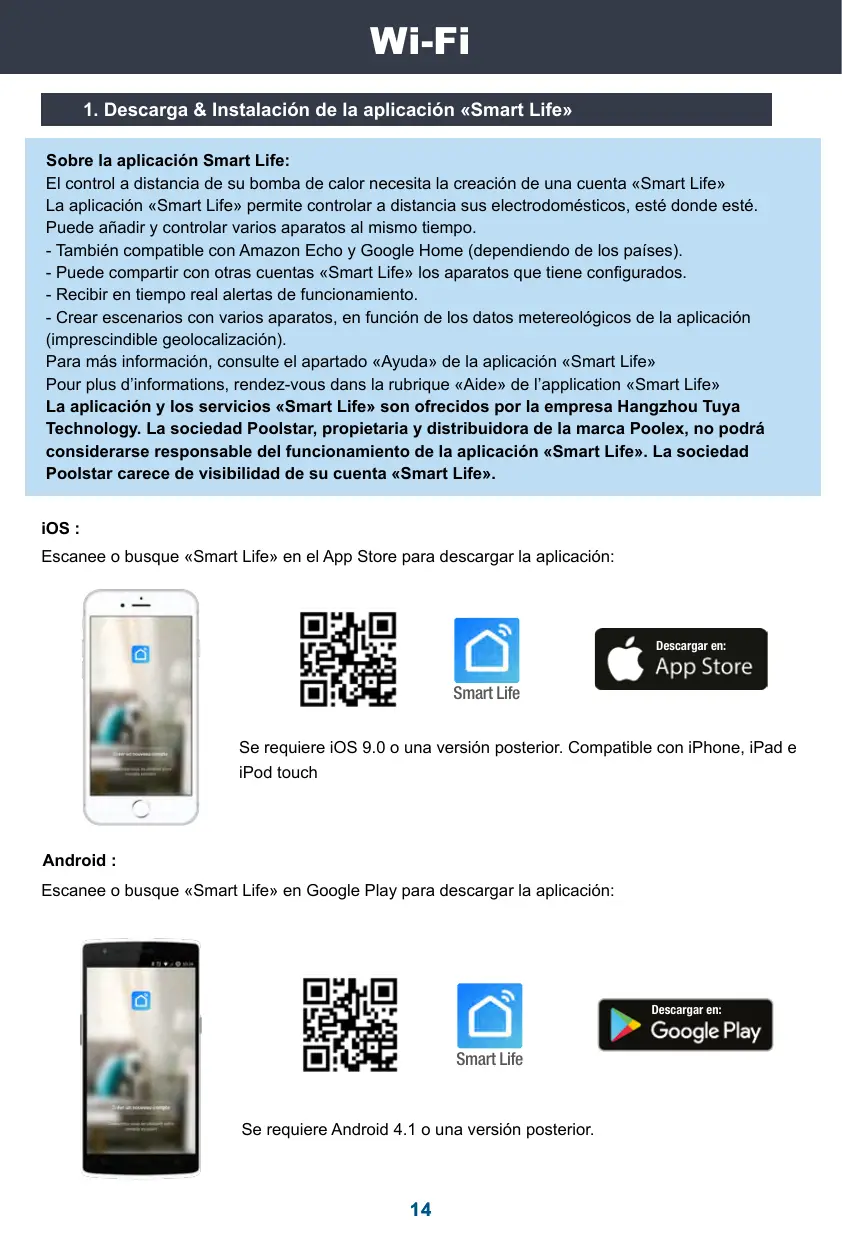 L'application et les services «Smart Life» sont fournis par la société Hangzhou Tuya Techno- logy. La société Poolstar, propriétaire et distributeur de la marque Poolex, ne pourra être tenu responsable du fonctionnement de l'application «Smart Life». La société Poolstar n’a aucune visibilité sur votre compte «Smart Lit