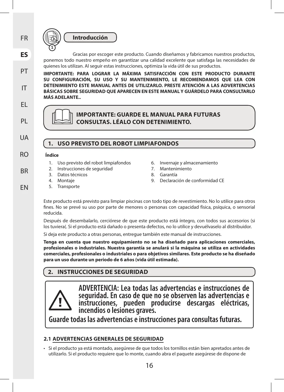 indice 1. Uso previsto del robot limpiafondos 2. Instrucciones de seguridad 3. Datostécnicos 4. Montaje 5. Transporte