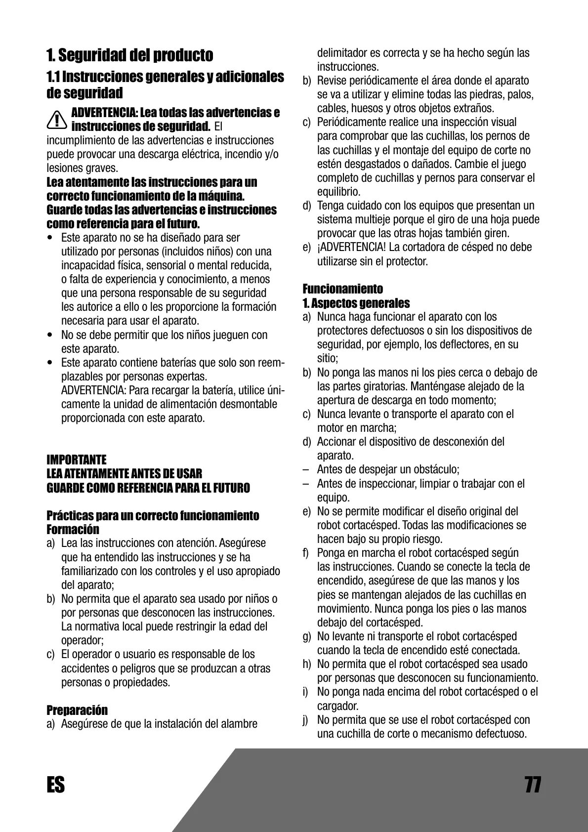 h) Ne laissez en aucun cas la tondeuse à une personne non familiarisée avec l'appareil et son mode d'utilisation.