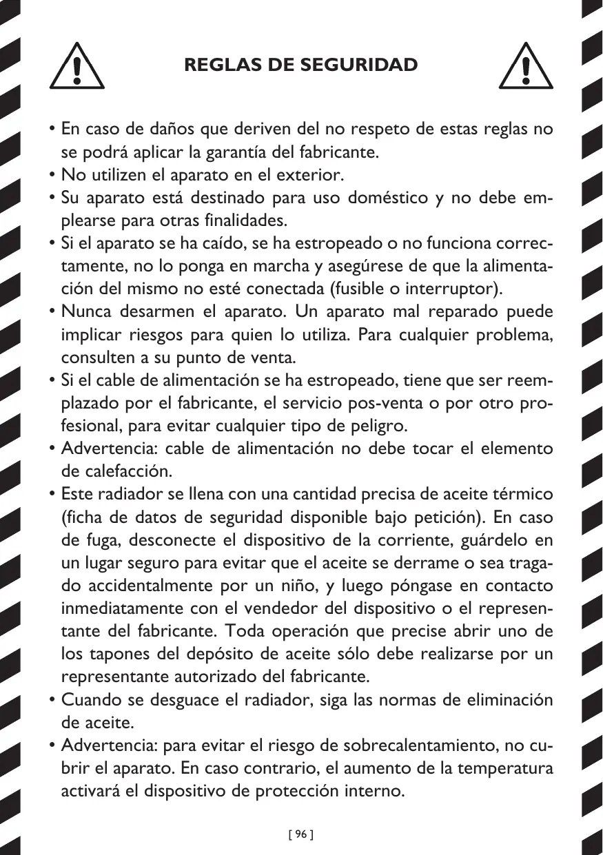 Este radiador se Ilena con una cantidad precisa de aceite térmico (ficha de datos de seguridad disponible bajo peticién). En caso de fuga, desconecte el dispositivo de la corriente, guärdelo en un lugar seguro para evitar que el aceite se derrame o sea traga- do accidentalmente por un niño, y luego péngase en contacto inmediatamente con el vendedor del dispositivo o el represen- tante del fabricante. Toda operacién que precise abrir uno de los tapones del depésito de aceite sélo debe realizarse por un representante autorizado del fabricante.