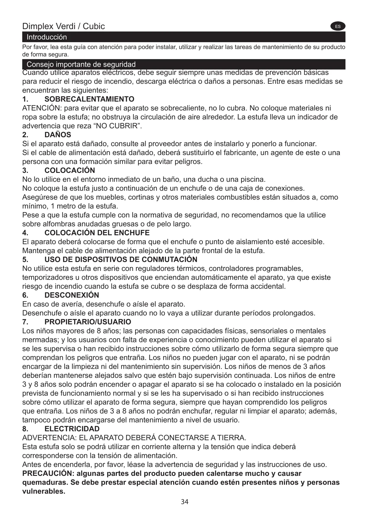 No coloque la estufa justo a continuacién de un enchufe o de una caja de conexiones. Asegürese de que los muebles, cortinas y otros materiales combustibles estän situados a, como minimo, 1 metro de la estufa. Pese a que la estufa cumple con la normativa de seguridad, no recomendamos que la utilice sobre alfombras anudadas gruesas o de pelo largo. 4. COLOCACIÔN DEL ENCHUFE El aparato deberé colocarse de forma que el enchufe o punto de aislamiento esté accesible. Mantenga el cable de alimentacién alejado de la parte frontal de la estufa. 5. USO DE DISPOSITIVOS DE CONMUTACIÔN No utilice esta estufa en serie con reguladores térmicos, controladores programables, temporizadores u otros dispositivos que enciendan automäticamente el aparato, ya que existe riesgo de incendio cuando la estufa se cubre o se desplaza de forma accidental. 6. DESCONEXION En caso de averia, desenchufe o aisle el aparato. Desenchufe o aisle el aparato cuando no lo vaya a utilizar durante periodos prolongados. 7. PROPIETARIO/USUARIO Los niños mayores de 8 años; las personas con capacidades fisicas, sensoriales o mentales mermadas; y los usuarios con falta de experiencia o conocimiento pueden utilizar el aparato si se les supervisa o han recibido instrucciones sobre cômo utilizarlo de forma segura siempre que comprendan los peligros que entraña. Los niños no pueden jugar con el aparato, ni se podrän encargar de la limpieza ni del mantenimiento sin supervisién. Los niños de menos de 3 años deberfan mantenerse alejados salvo que estén bajo supervisién continuada. Los niños de entre 3 y 8 años solo podrän encender o apagar el aparato si se ha colocado o instalado en la posiciôn prevista de funcionamiento normal y si se les ha supervisado o si han recibido instrucciones sobre como utilizar el aparato de forma segura, siempre que hayan comprendido los peligros que entraña. Los niños de 3 a 8 años no podrän enchufar, regular ni limpiar el aparato; ademäs, tampoco podrän encargarse del mantenimiento a nivel de usuario. 8. ELECTRICIDAD ADVERTENCIA: EL APARATO DEBERÂ CONECTARSE A TIERRA. Esta estufa solo se podré utilizar en corriente alterna y la tensién que indica deberä corresponderse con la tensiôn de alimentacién. Antes de encenderla, por favor, léase la advertencia de seguridad y las instrucciones de uso. PRECAUCIÔN: algunas partes del producto pueden calentarse mucho y causar quemaduras. Se debe prestar especial atencién cuando estén presentes niños y personas vulnerables.