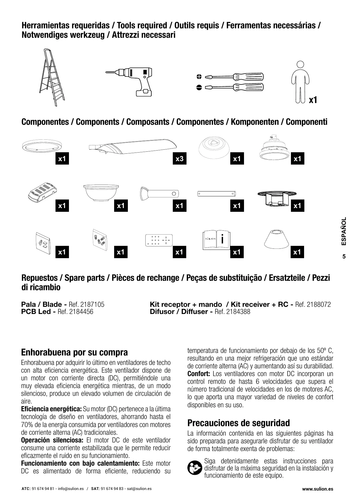 éventuelles réparations ou fourniture de pièces détachées en cas de défaut de fabrication jusqu'à 3 ans à compter de la date de vente. Cette garantie est de 5 ans pour les diodes LED et de 8 ans pour le moteur du ventilateur DC. Sulion n'est pas responsable d'une mauvaise utilisation.