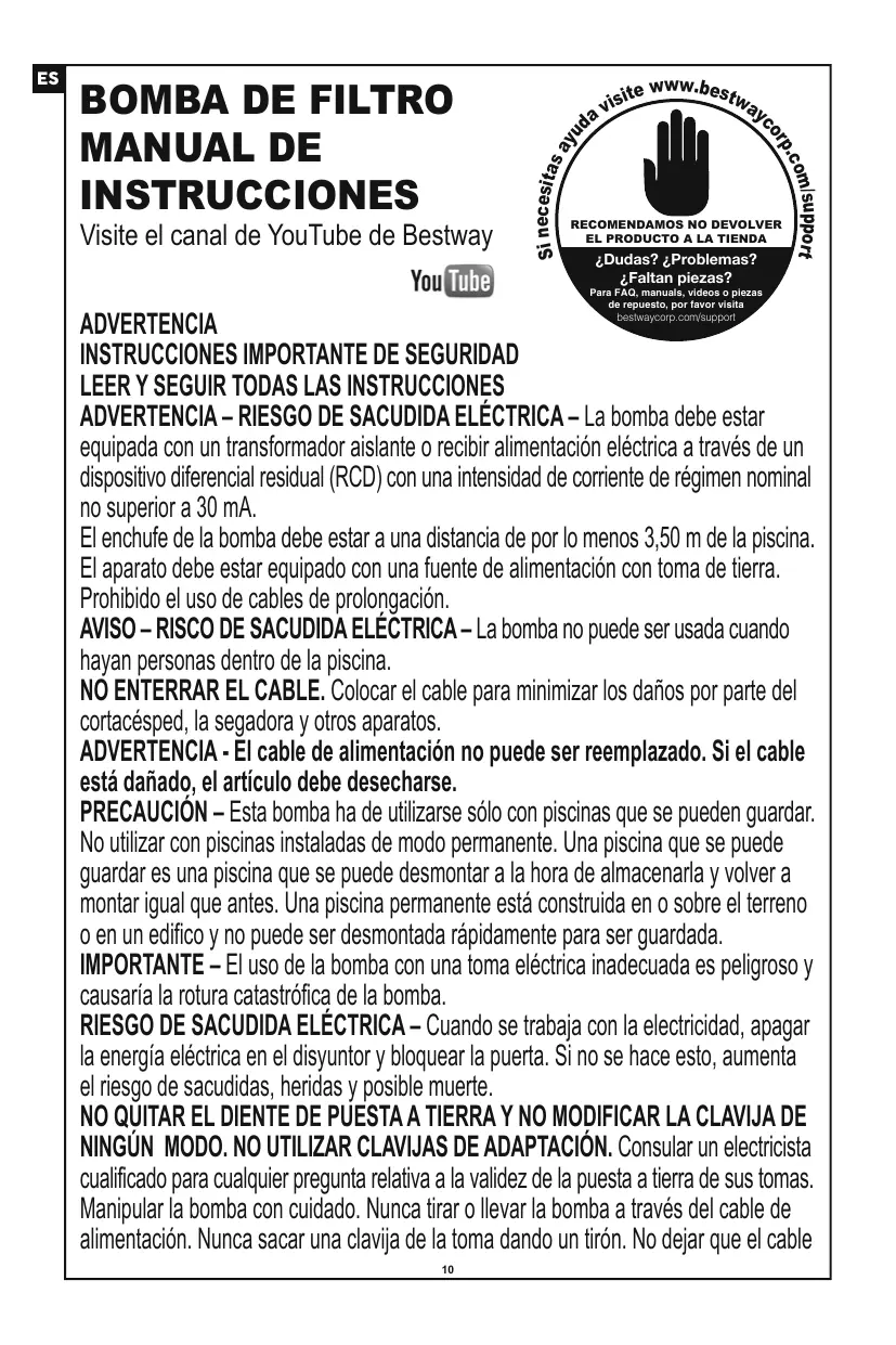 BOMBA DE FILTRO MANUAL DE INSTRUCCIONES Visite el canal de YouTube de Bestway © ["étenonuero a a nienDa YouQTn "rater