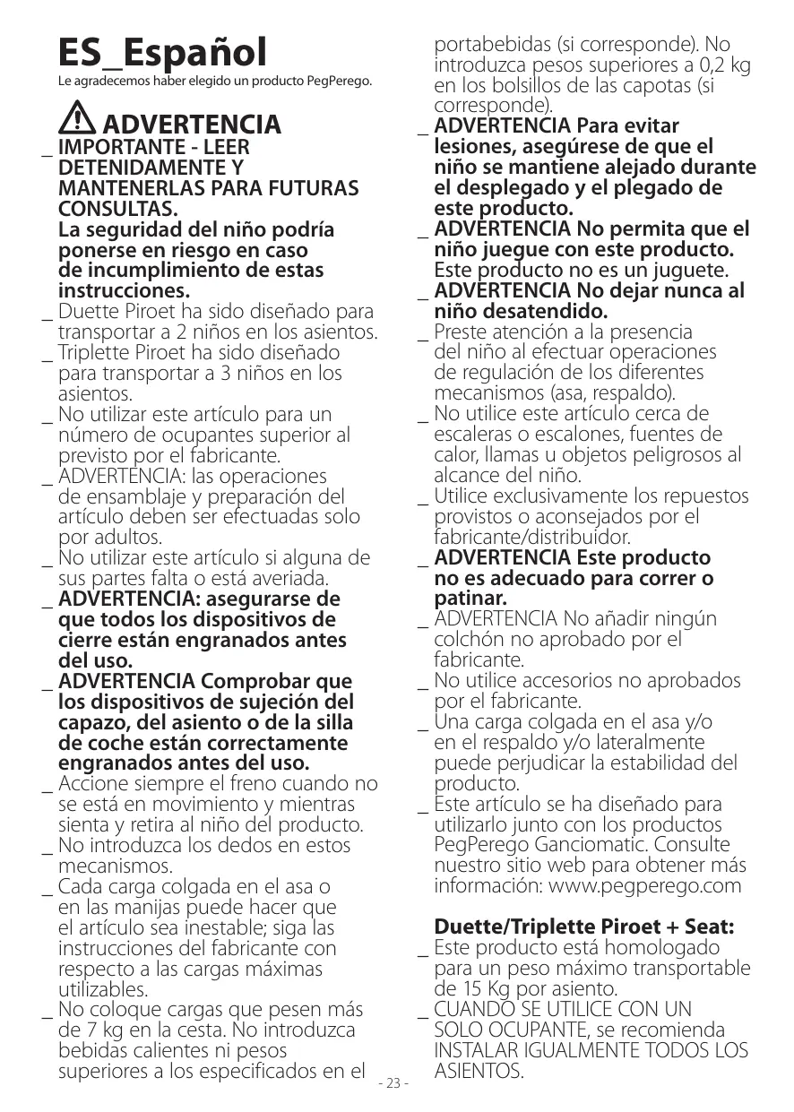 DUETTE PIROET - Cochecitos dobles PEG PEREGO - Manual de uso y guía de instrucciones gratis