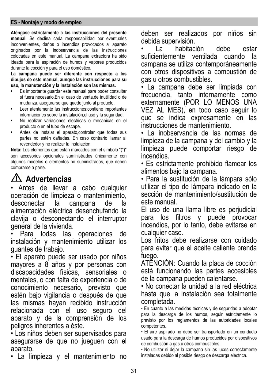 + Ne pas utiliser ou laisser la hotte sans les lampes correctement montées, car un éventuel risque de choc électrique est possible.