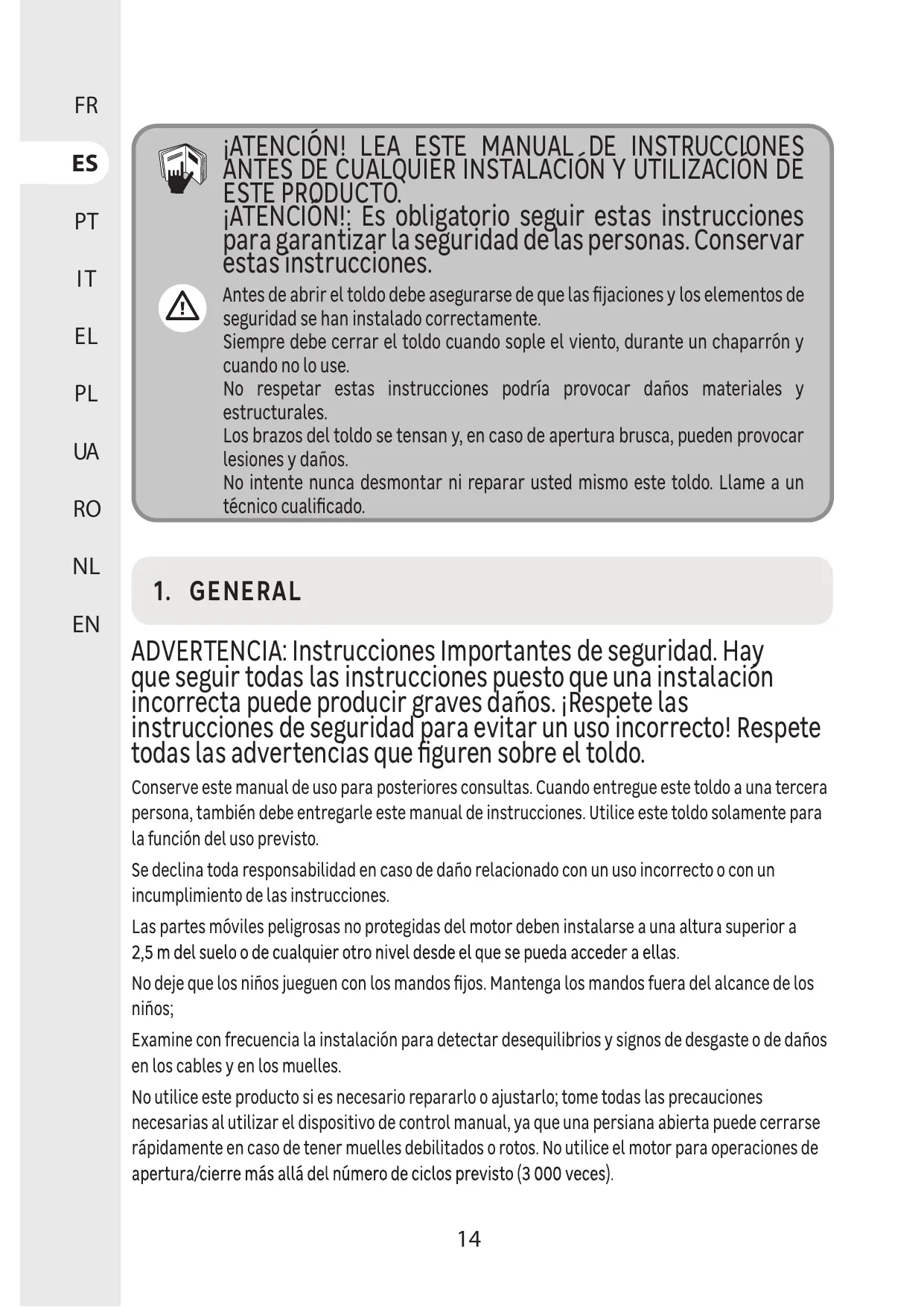AVERTISSEMENT : Consignes importantes de sécurité Il est impératif de suivre ces instructions afin d'assurer la sécurité des personnes. Conservez ces instructions. VAN Avant d'ouvrir le store banne vous devez être sûr que les fixations et Les éléments de sécurité ont été installés de façon correcte. Vous devez toujours fermer votre store banne quand le vent souffle, durant une averse et quand vous n’en avez pas l'usage. Ne pas respecter ces consignes pourrait provoquer des dommages matériels et structurels. Les bras du store banne sont tendus et peuvent provoquer en cas d'ouverture brutale, des blessures et des dommages. Ne jamais essayer de démonter ou de réparer vous-même ce store banne. LC Faites appel à un technicien qualifié. )