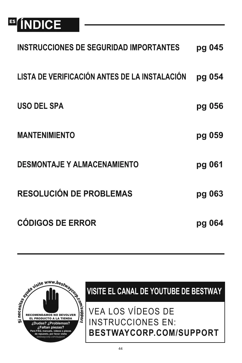 USO DEL SPA pg 056 MANTENIMIENTO pg 059 DESMONTAJE Y ALMACENAMIENTO pg 061 RESOLUCION DE PROBLEMAS pg 063 CODIGOS DE ERROR pg 064