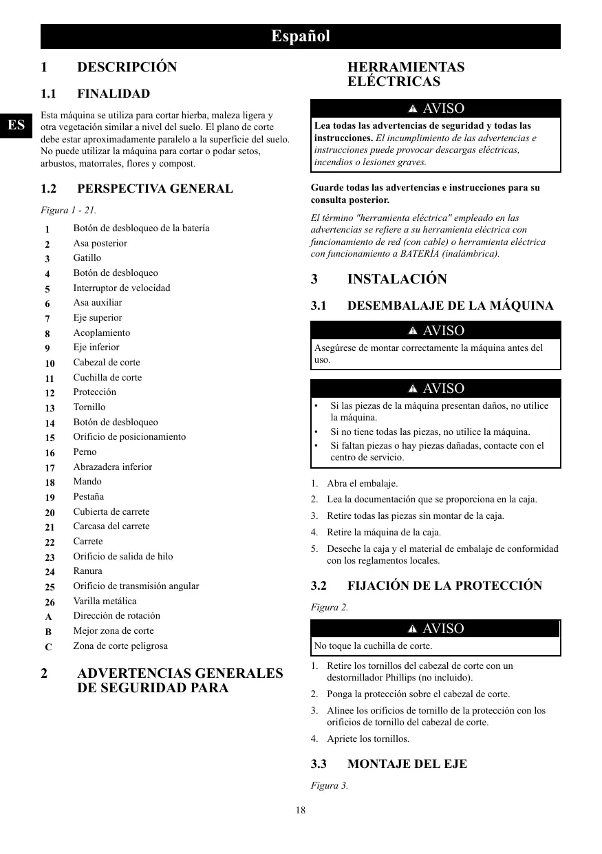 Desembalaje de la mäquina... 18 Fijaciôn de la protecciôn. 18 Montaje del eje… 18 Fijaciôn del asa auxiliar.… 19 Instalaciôn de la bateria.. 19 Retirada de la bateria. 19