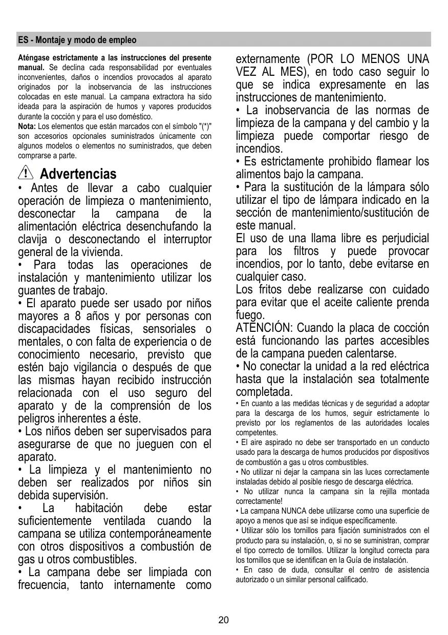 + Ne pas utiliser ou laisser la hotte sans les lampes correctement montées, car un éventuel risque de choc