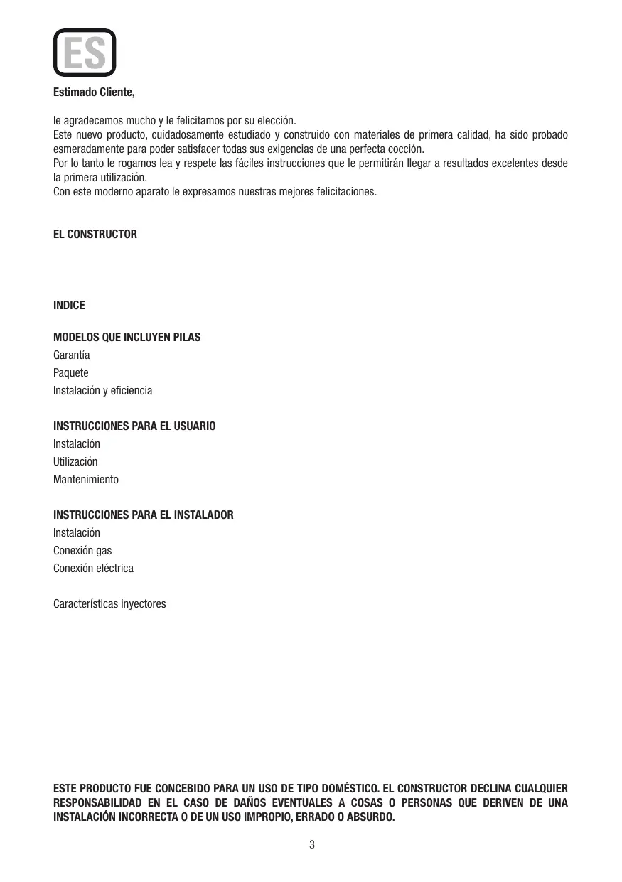 Estimado Cliente, le agradecemos mucho y le felicitamos por su elecciôn. Este nuevo producto, cuidadosamente estudiado y construido con materiales de primera calidad, ha sido probado esmeradamente para poder satisfacer todas sus exigencias de una perfecta cocciôn. Por lo tanto le rogamos lea y respete las fäciles instrucciones que le permitirän Ilegar a resultados excelentes desde la primera utlizaciôn. Con este moderno aparato le expresamos nuestras mejores felicitaciones. EL CONSTRUCTOR INDICE